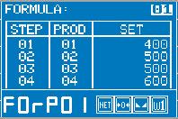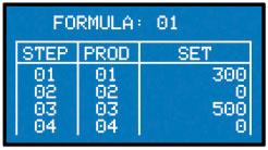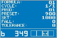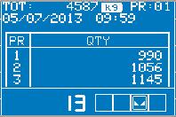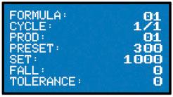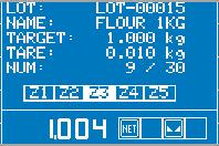 Ermöglicht dem Bediener, die manuelle assistierte Dosierung auszuführen: Die erste Zeile zeigt die Nummer der Rezeptur und das Bruttogewicht an; die zweite Zeile zeigt die Nummer des Produkts und die zu dosierende Menge an, die beim Laden des Produkts gegen Null abnimmt.