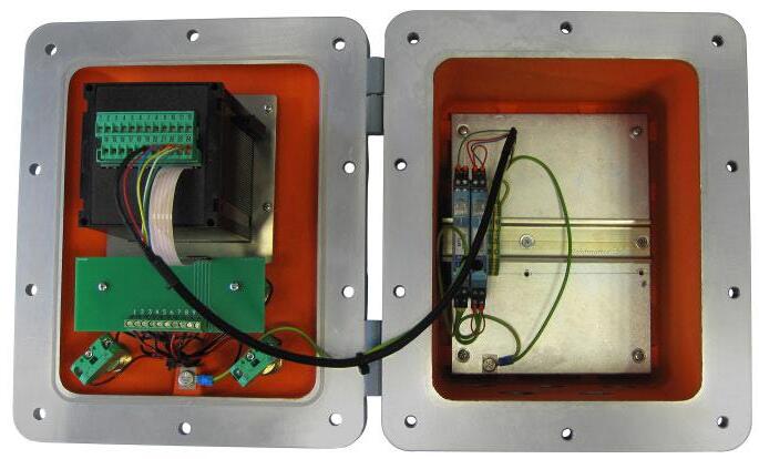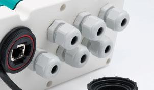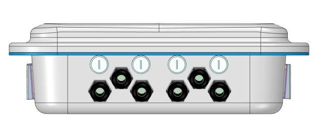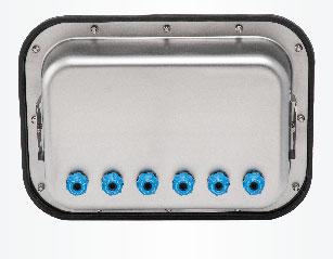 IP67-Gehäuse aus Edelstahl AISI 304 oder glasfaserverstärktem Nylon PA66 (Abmessungen: 90x40x107 mm inklusive fliegende Verbinder).