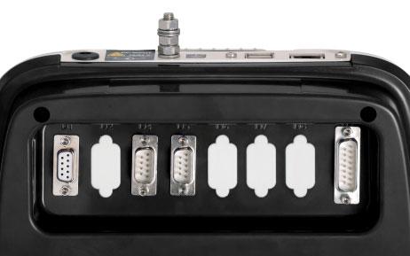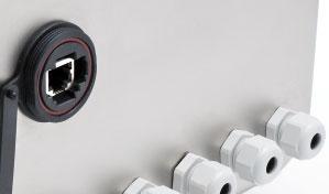 2x Rundsteckverbinder M12, A-codiert, 4-polig. Das Instrument arbeitet als Device in einem IO-Netzwerk.