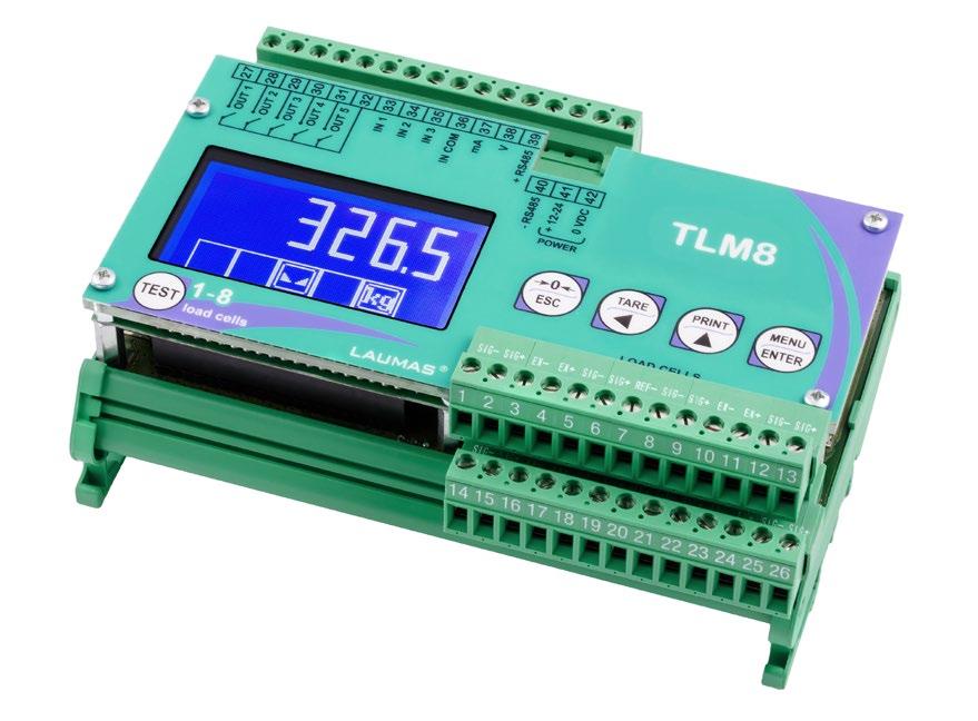 • TLM8: Display LCD gráfico STN de transmisión, blanco sobre fondo azul, resolución 128x64 pixel, retroiluminado, área visible 60x32 mm. Cinco teclas para la calibración. 8 entradas de células de carga. 5 salidas digitales de relé, 3 entradas digitales PNP optoaislada. Puerto serie RS485. Salida analógica de 16 bits en corriente o tensión. Montaje en la parte trasera del panel en barra Omega/DIN o en caja para instalaciones de campo (versiones en caja bajo pedido). Borneras de tornillo extraíbles.