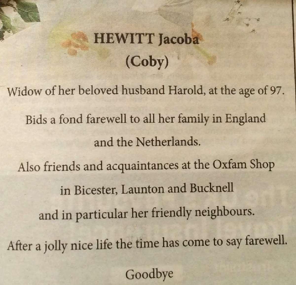 Below right is a photo of some of the group at work. Bottom left is the announcement of Coby’sdeath from The Bicester Advertiser that sums up this extraordinary woman - who had had a “jolly nice life”.