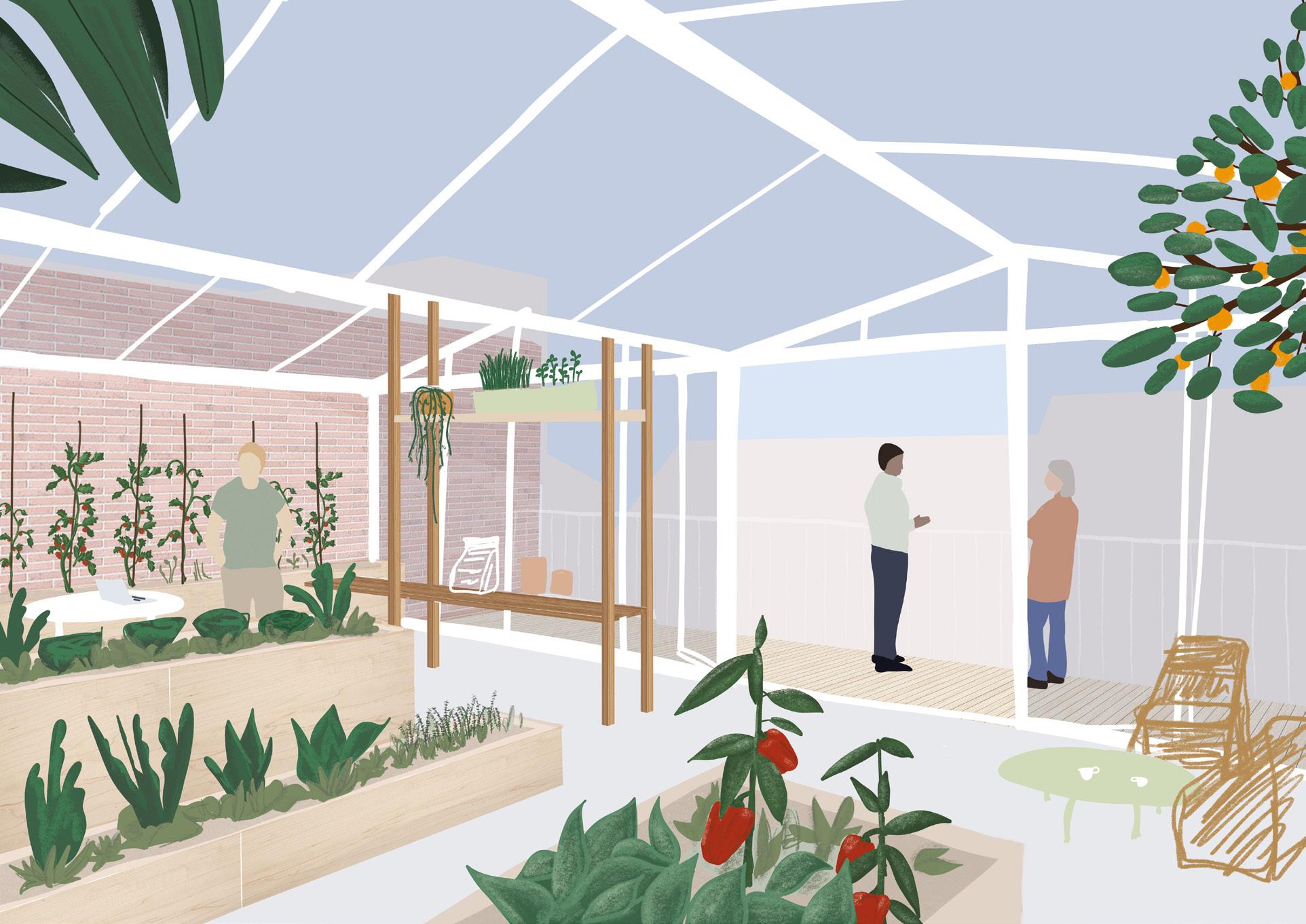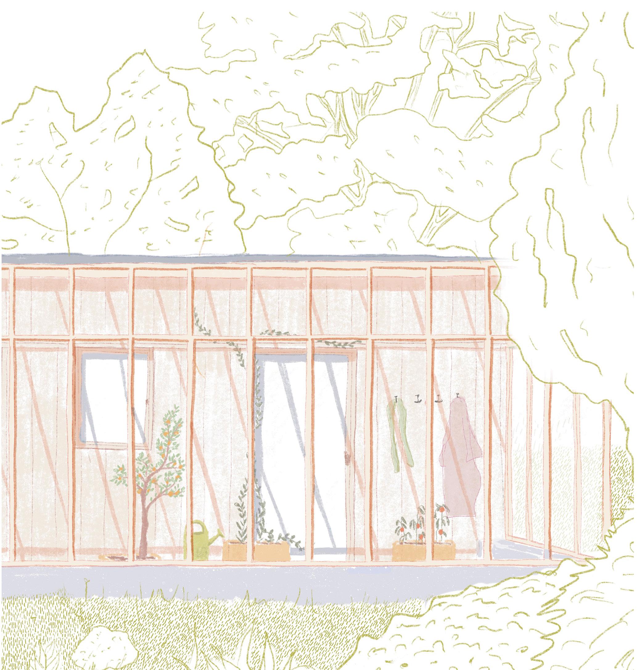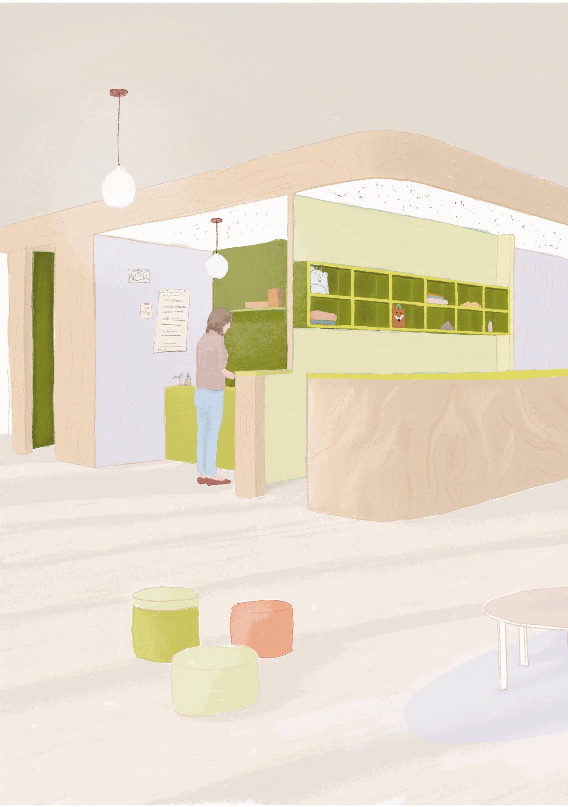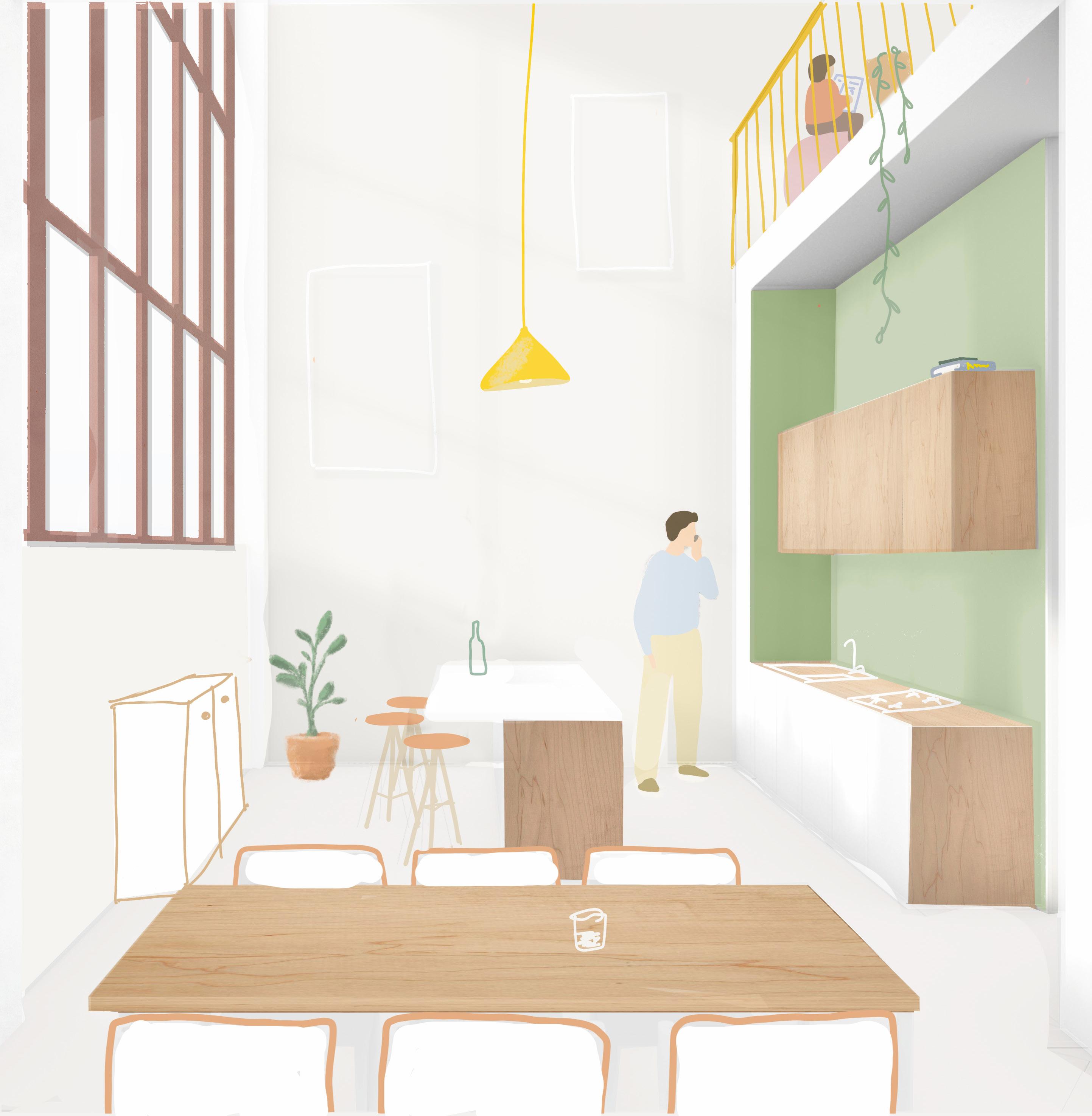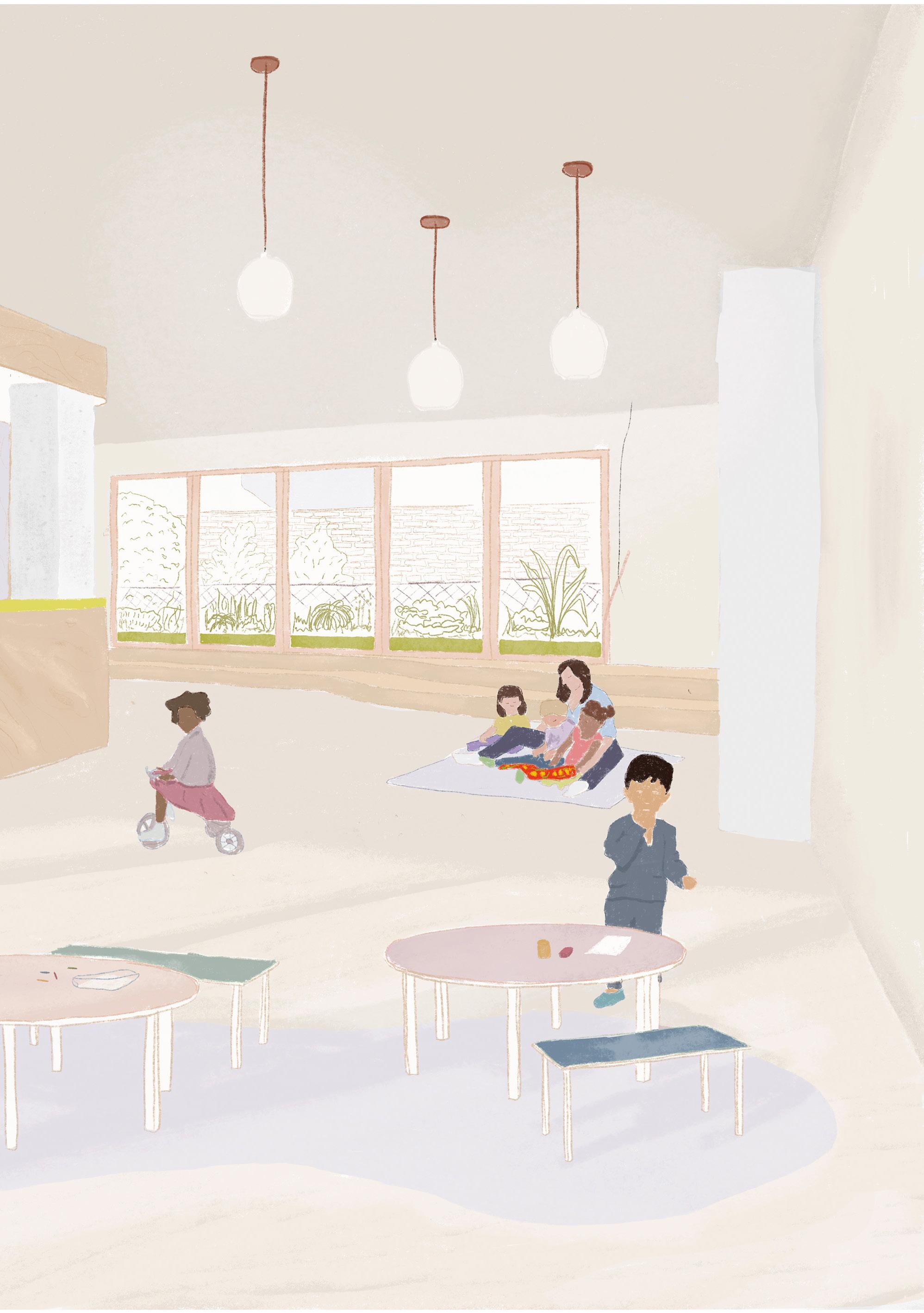 Images de concours pour une crèche : Perspectives intérieures, schémas urbains et élévation de façade sur Procreate.