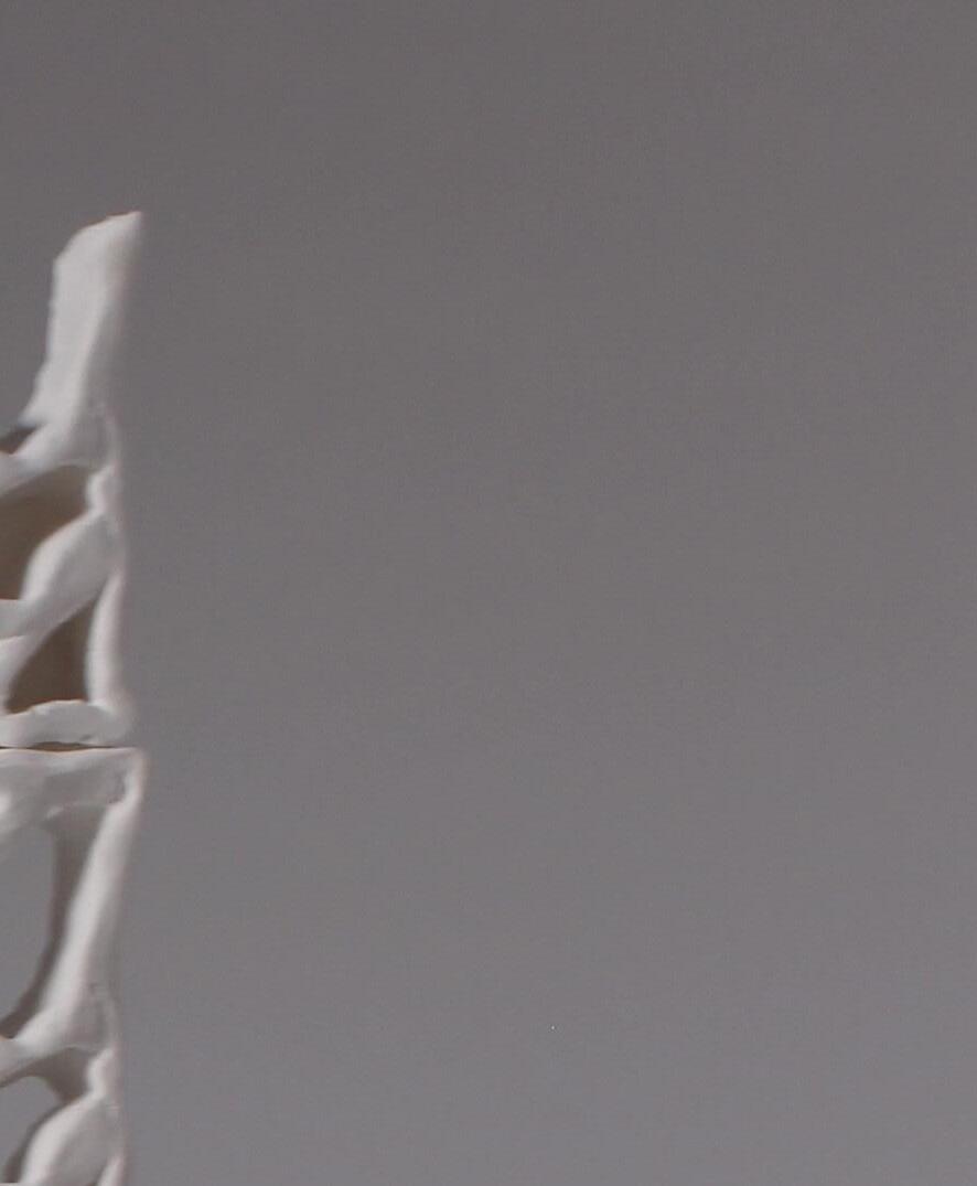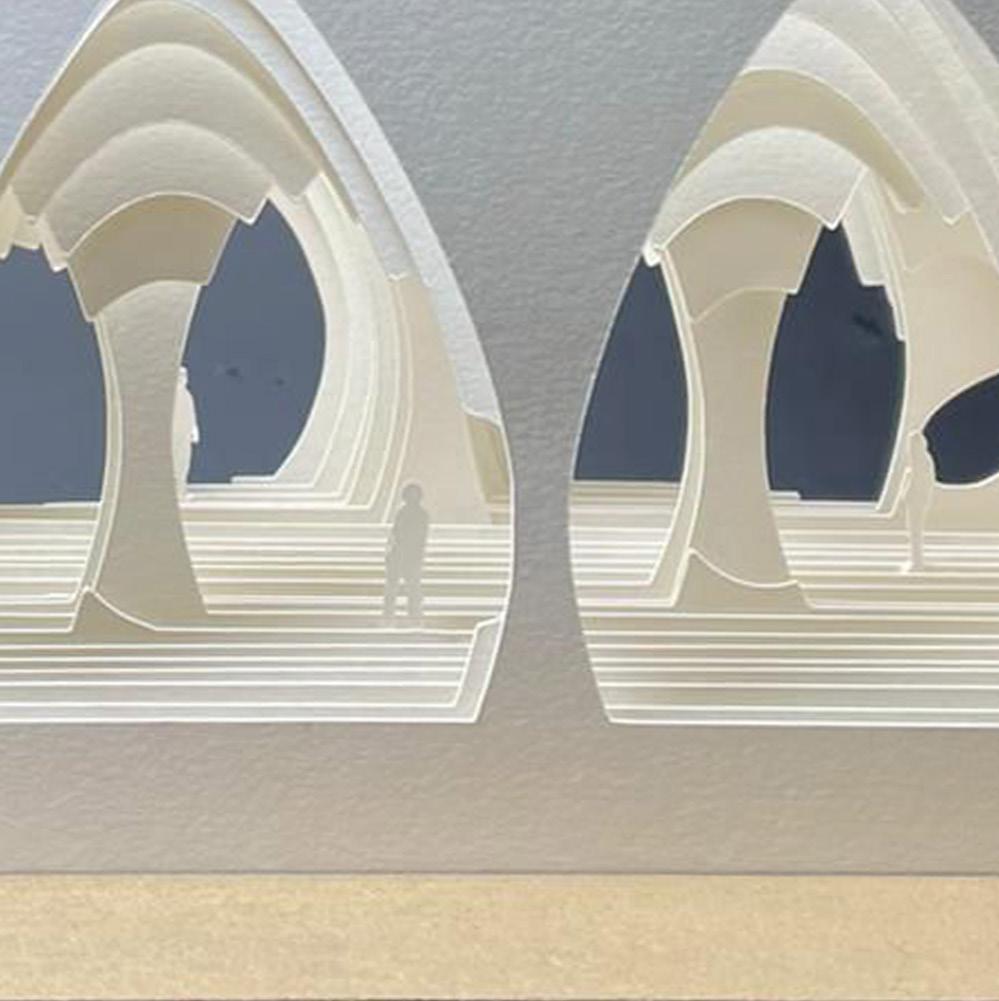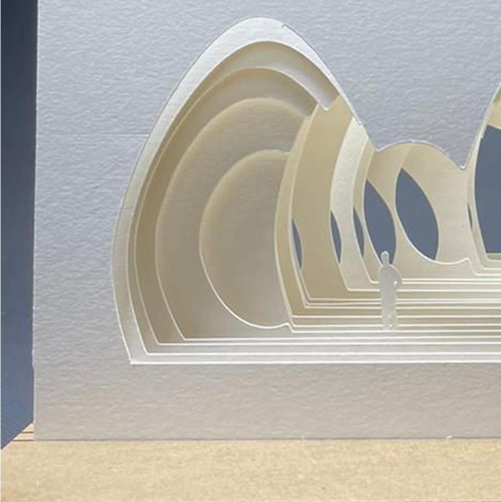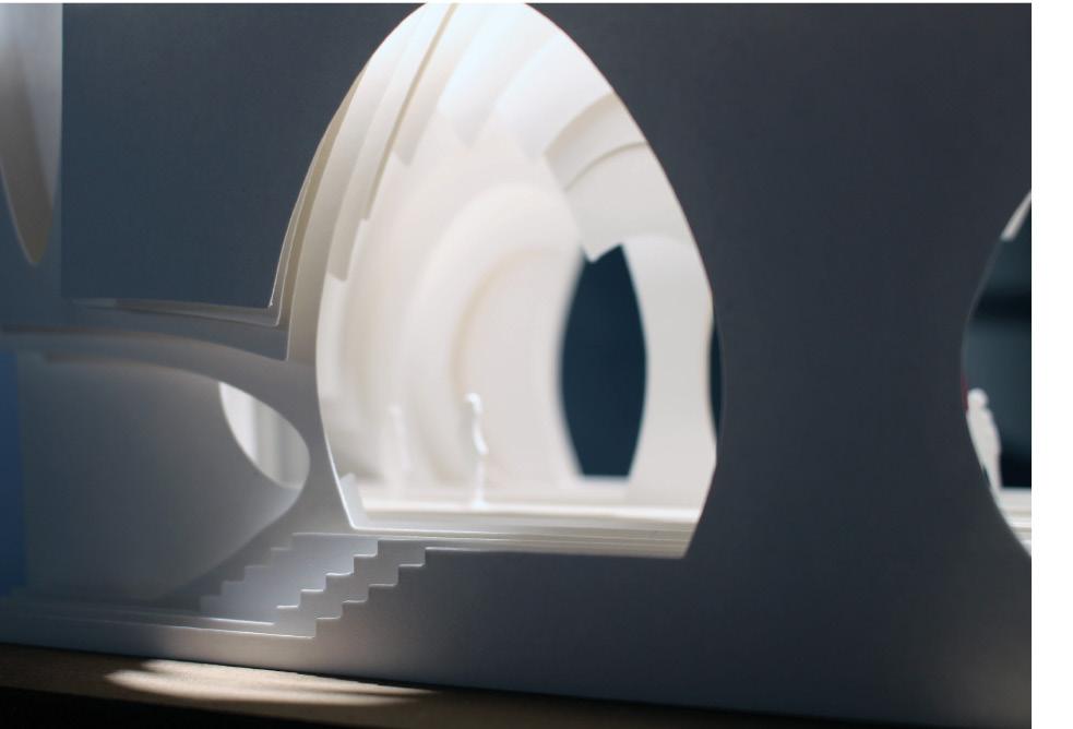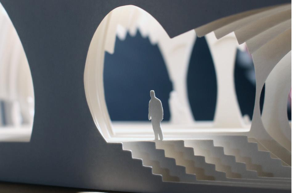 The model is composed of a series of 20 sections cut in paper and positioned 5mm apart, creating a 3D volume from 2D repetitive elements.