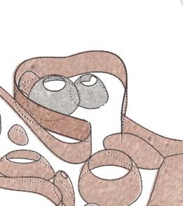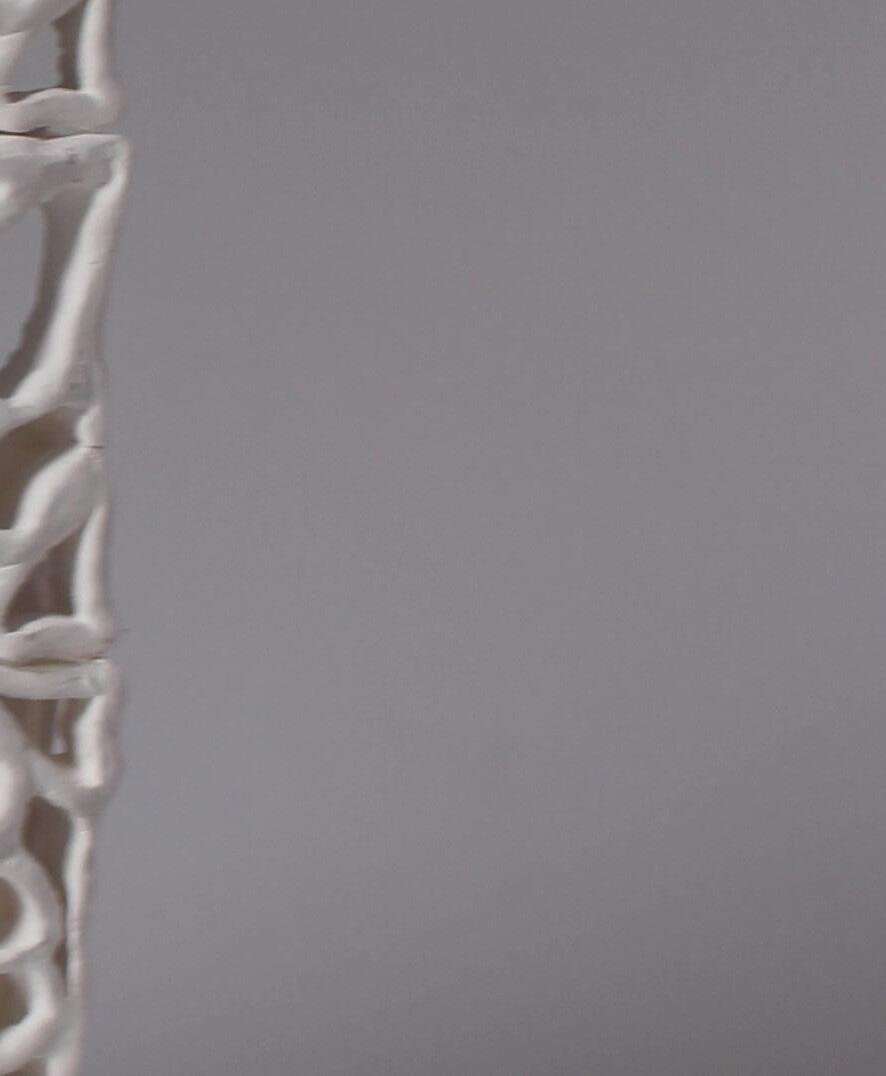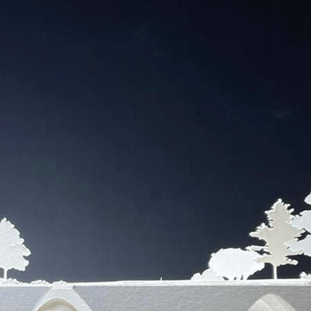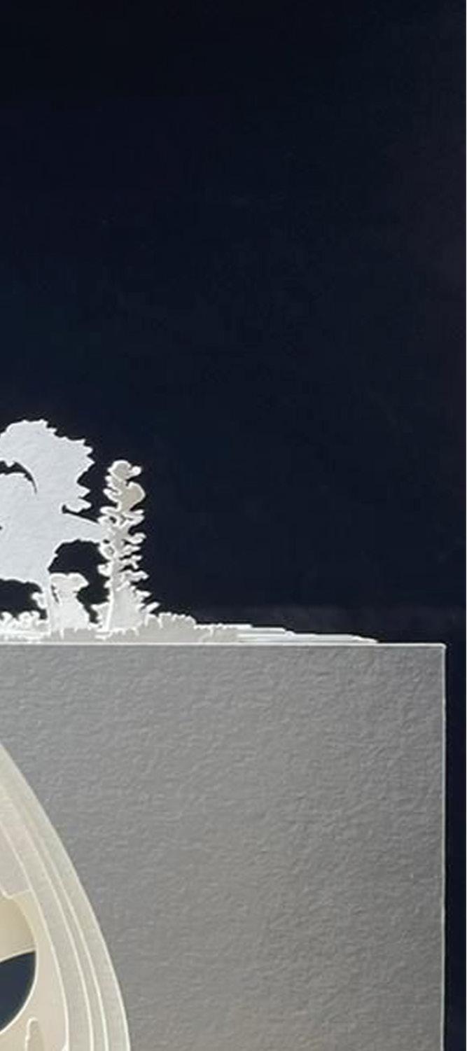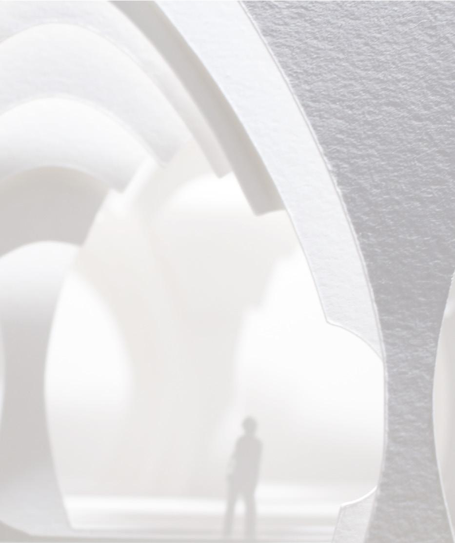 The model is composed of a series of 20 sections cut in paper and positioned 5mm apart, creating a 3D volume from 2D repetitive elements.