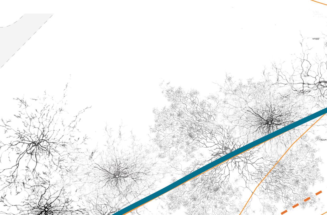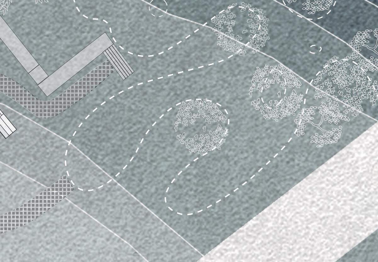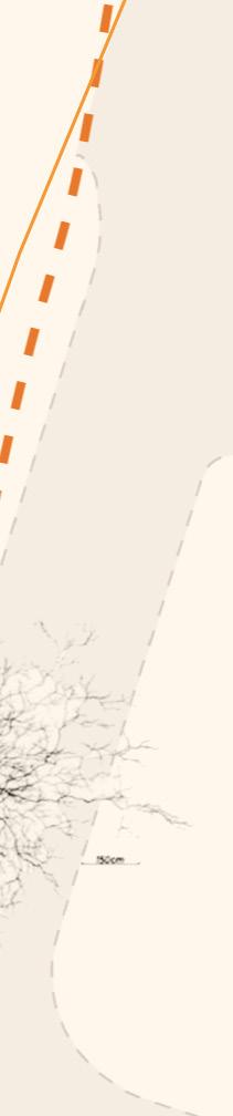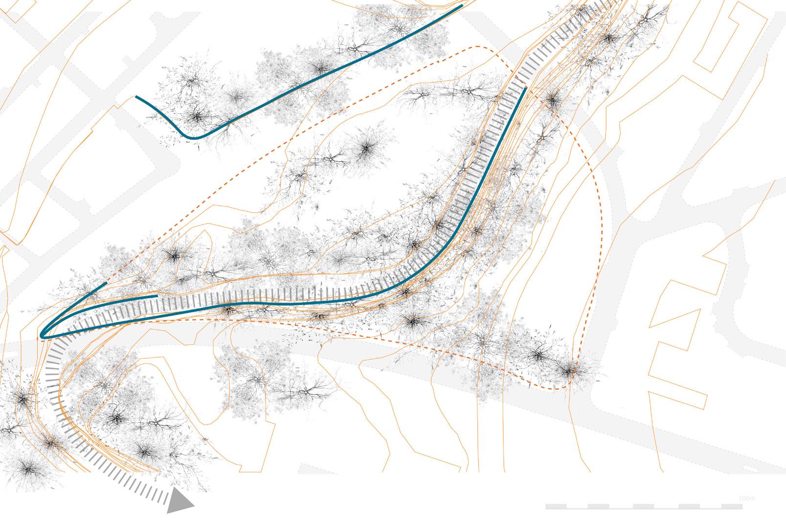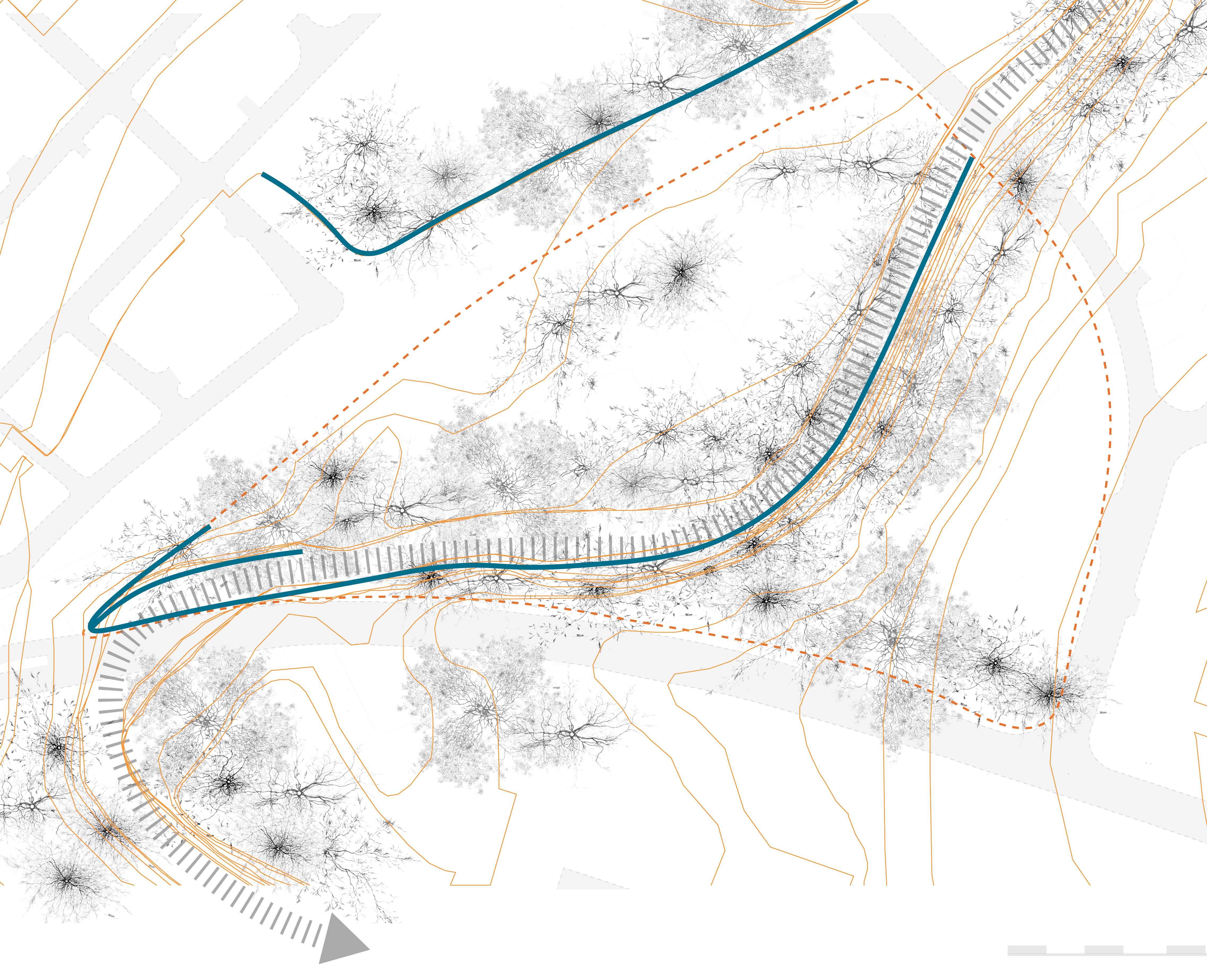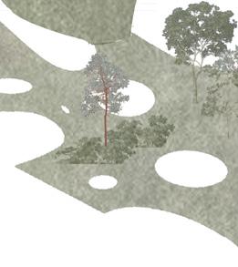In this context, ‘mother trees’ (the older trees) play a massive role in helping seedlings develop into healthy trees, as the number of connections is directly proportional to the age of the tree. On the site, this connection is broken by an abrupt level change (blue line). My plan is to patch up this separation between the vegetation on site by creating a connecting system from above using mycelium.