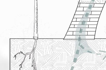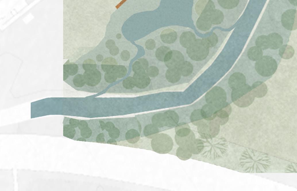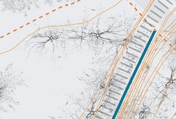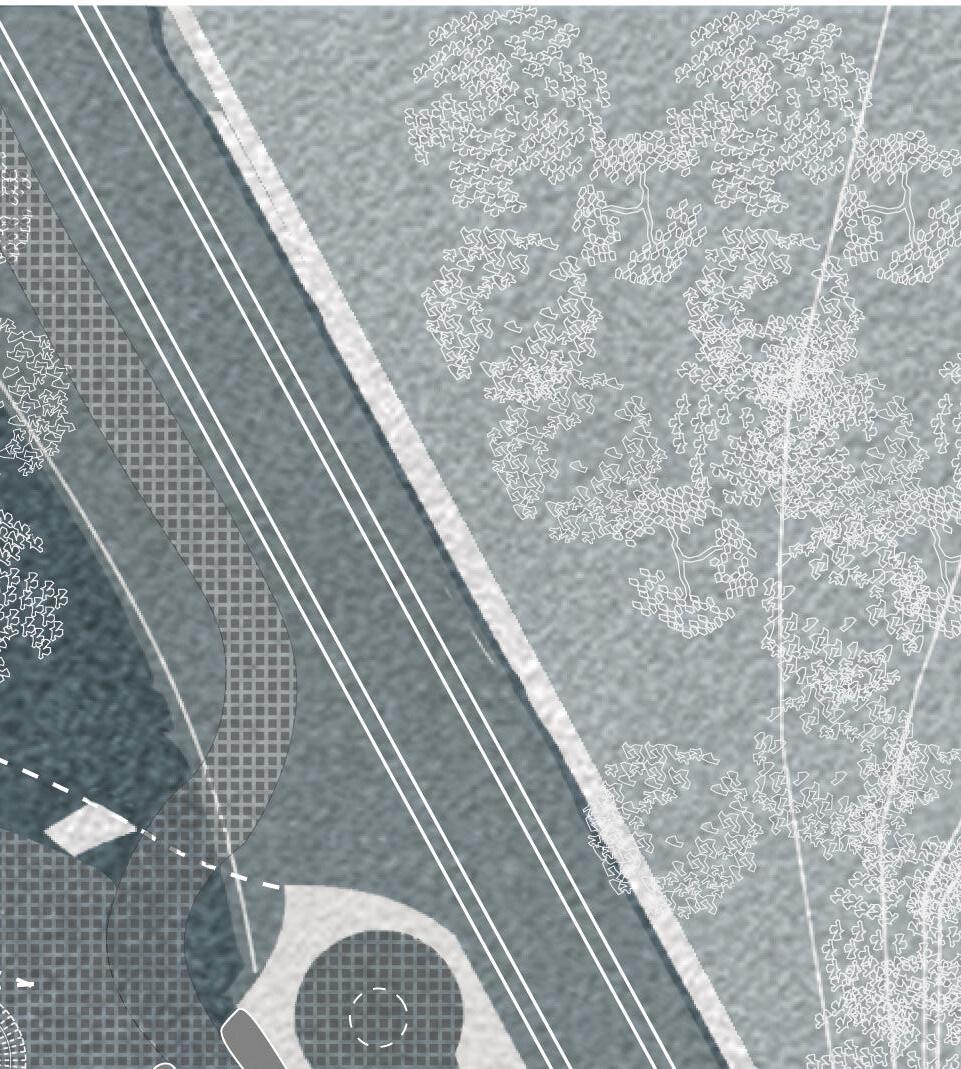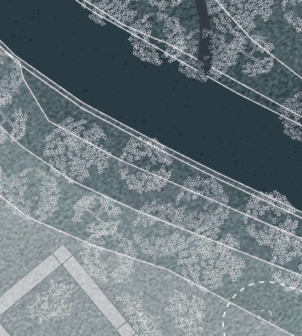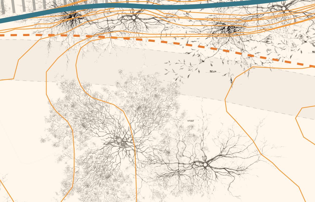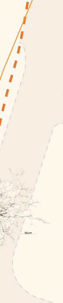In this context, ‘mother trees’ (the older trees) play a massive role in helping seedlings develop into healthy trees, as the number of connections is directly proportional to the age of the tree. On the site, this connection is broken by an abrupt level change (blue line). My plan is to patch up this separation between the vegetation on site by creating a connecting system from above using mycelium.