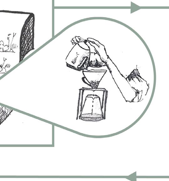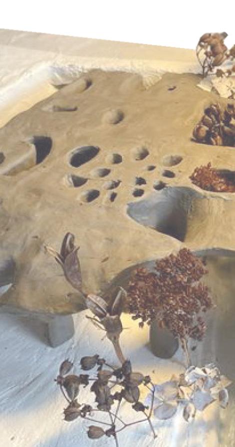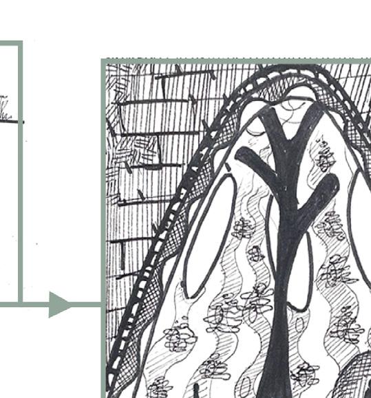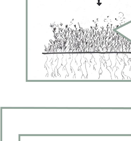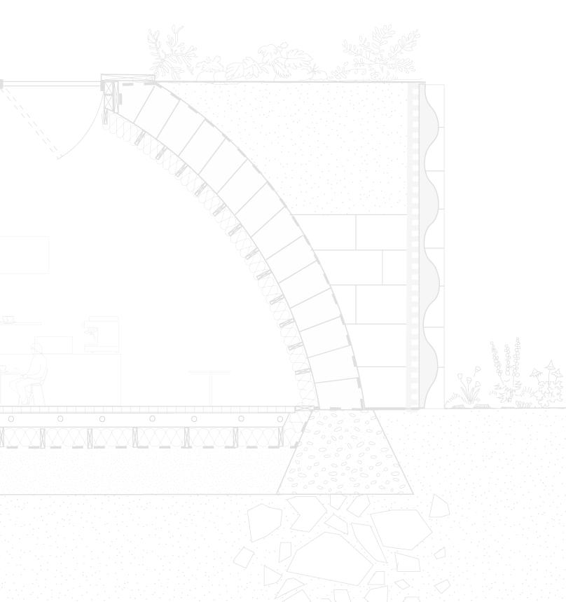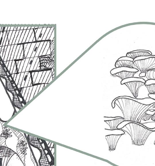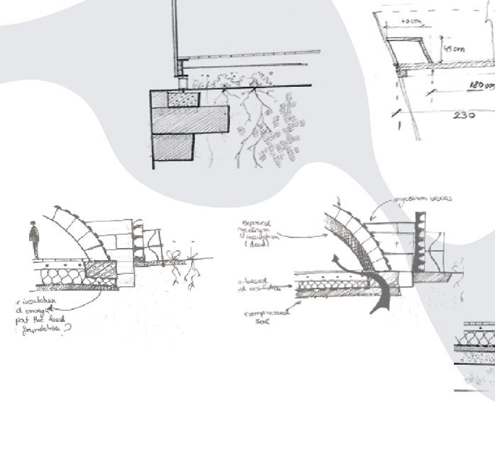 The cafe is finalised and starts operating, while collecting used coffee grounds and other compost, later to be used for the manufacture of the mycelium bricks. Next, the mycelium is placed on top of the earth bricks and then covered in soil. Wild vegetation is planted on top. Insects ‘move in’ and start feeding the mycelium. Next spring, the mycelium enters the germination and then the expansion phase, connecting the levels of vegetation and helping it develop. Finally, the mycelium is in the fruiting stage, when it produces mushrooms that can be consumed by the users ( both humans and non-humans). They are only accessible to humans in the spiritual area, area of intersection between humans and non-humans.