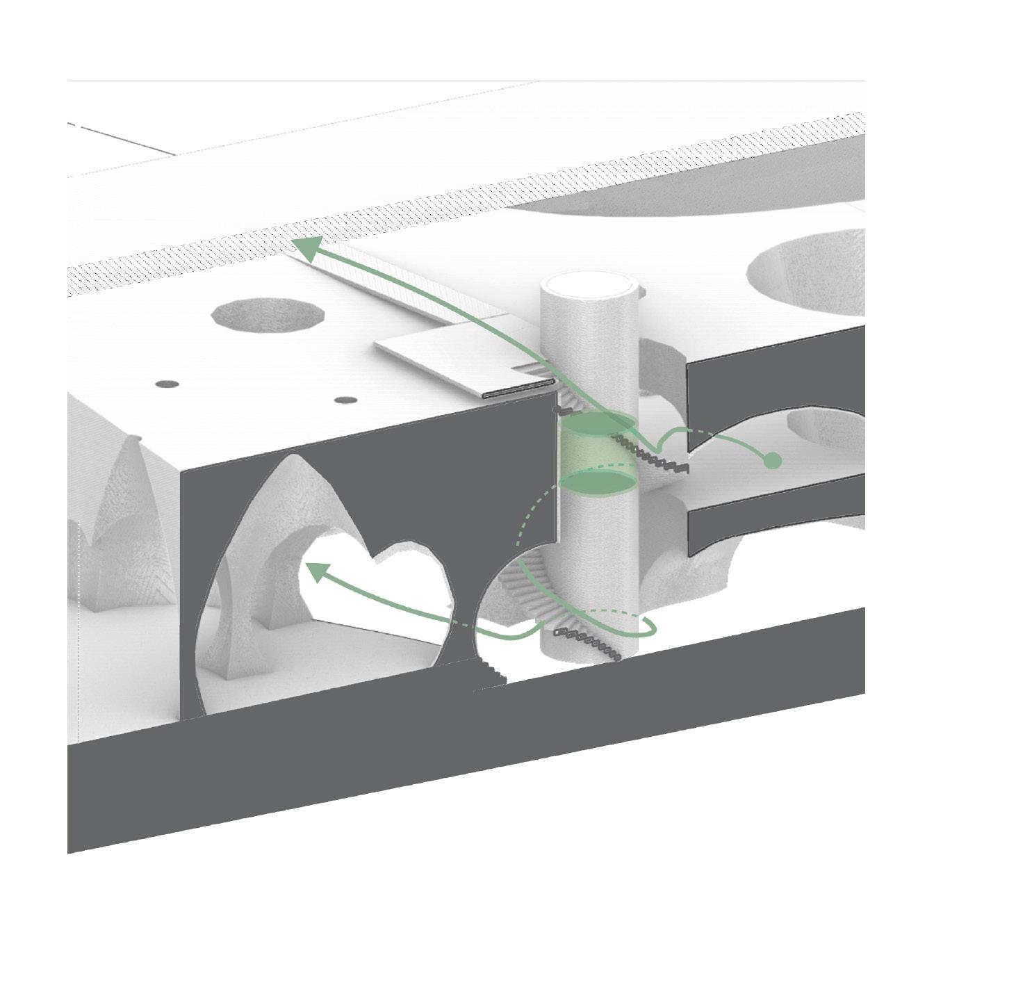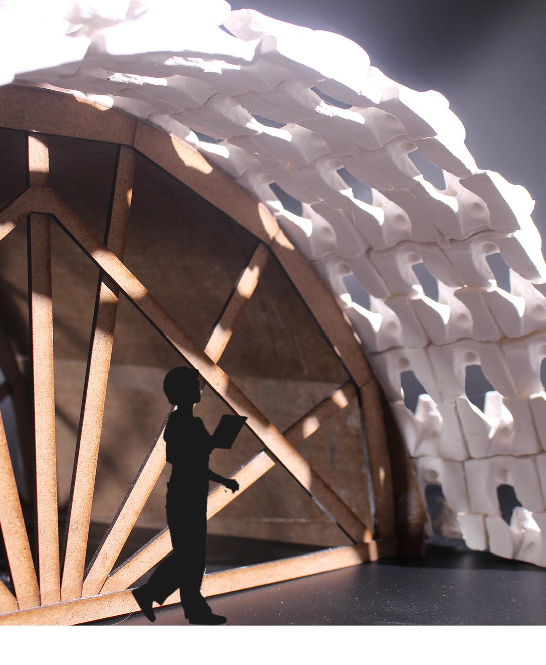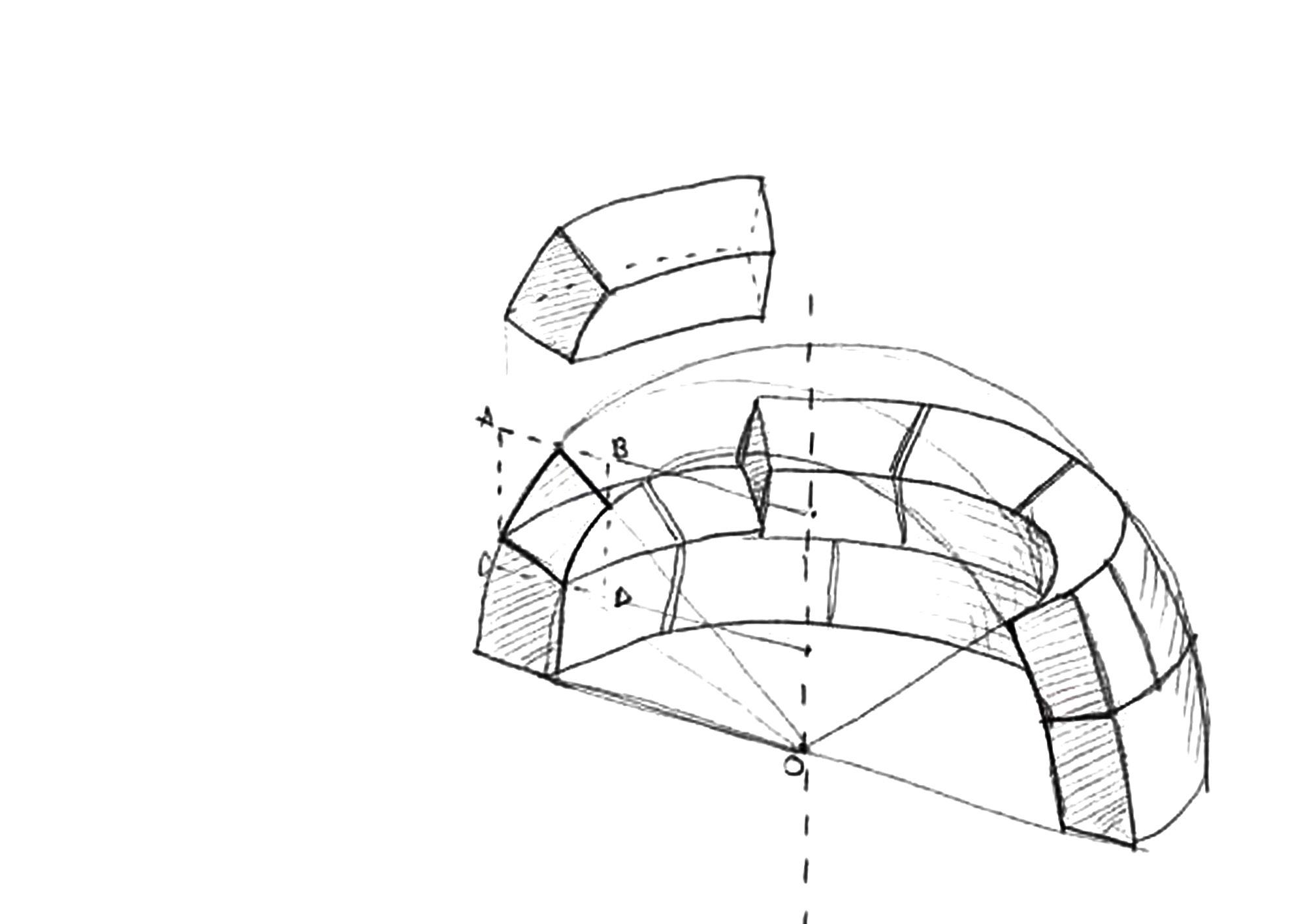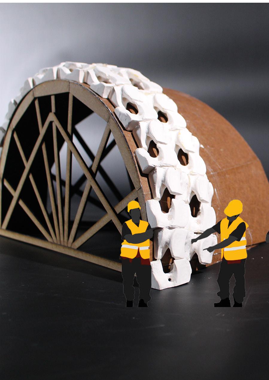Note: Creating the spaces from regular geometries, means that the bricks are repetitive. Therefore, only a limited number of moulds needs to be used. No framework is needed for the assembley.