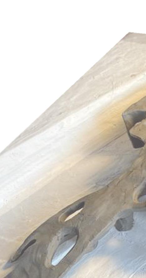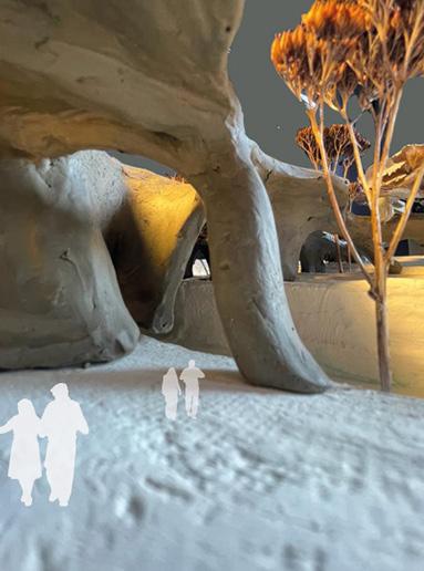 4. Spiritual space, the hearth of the architectural organism, (fact indicated by the central vertical pillar made out of mycelium) This space is bright yet solemn, creating the sense of spiritual awakening and contemplation alongside the realisation that mycelium is at the centre of the natural world.