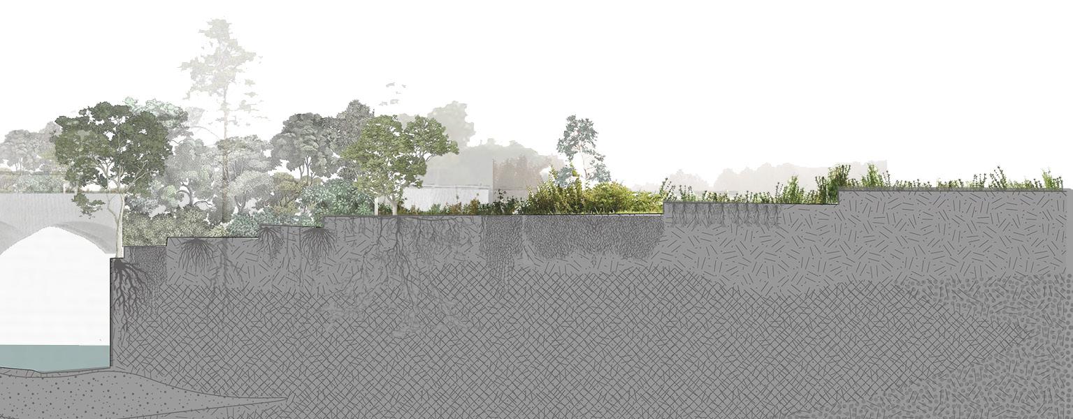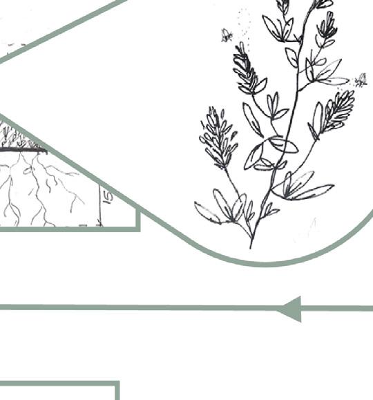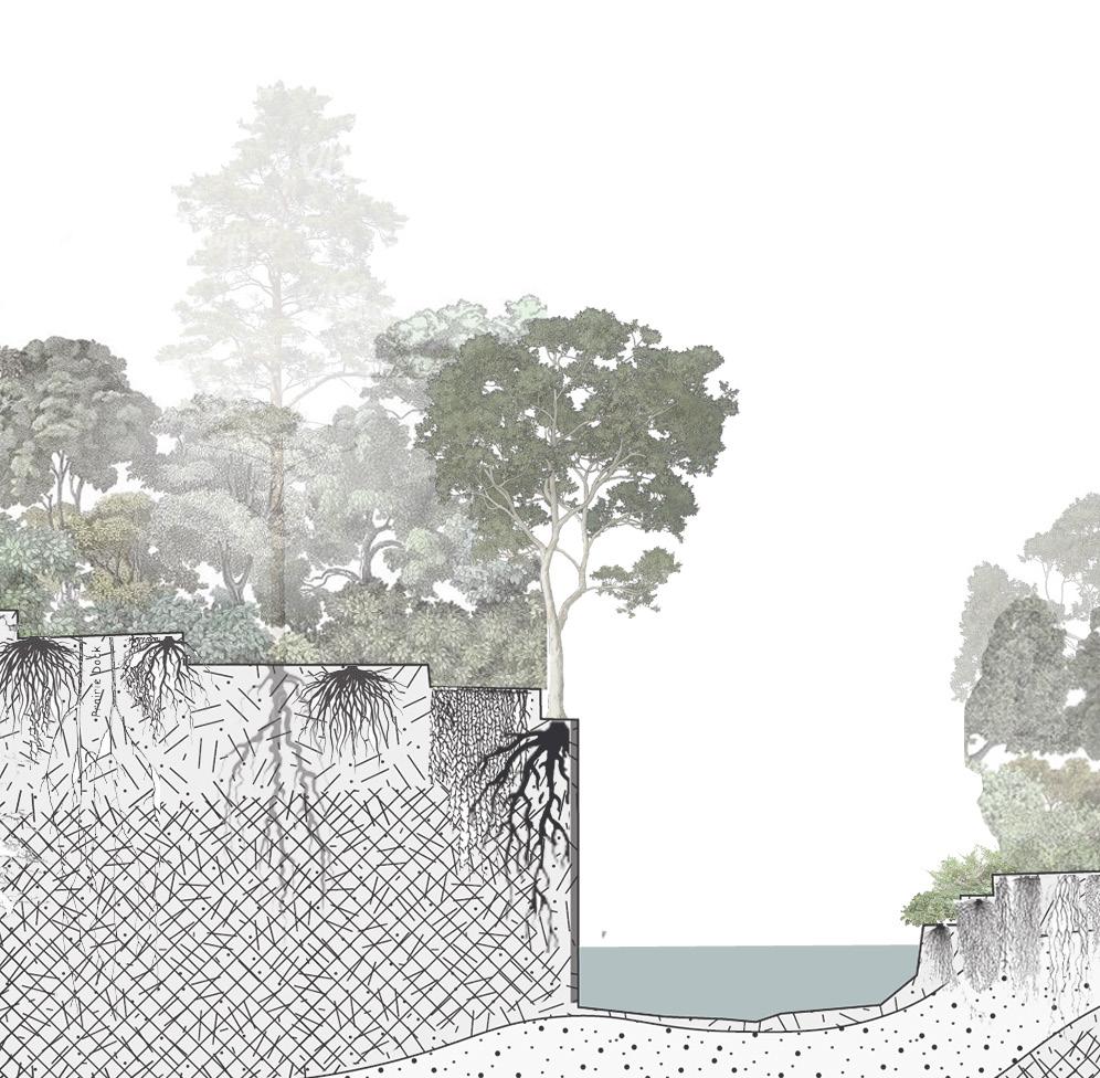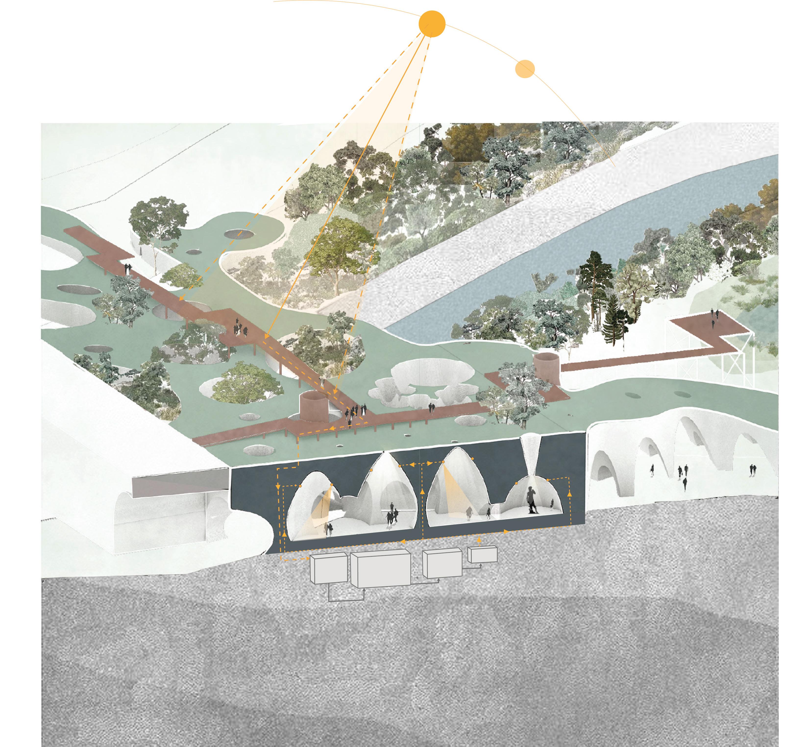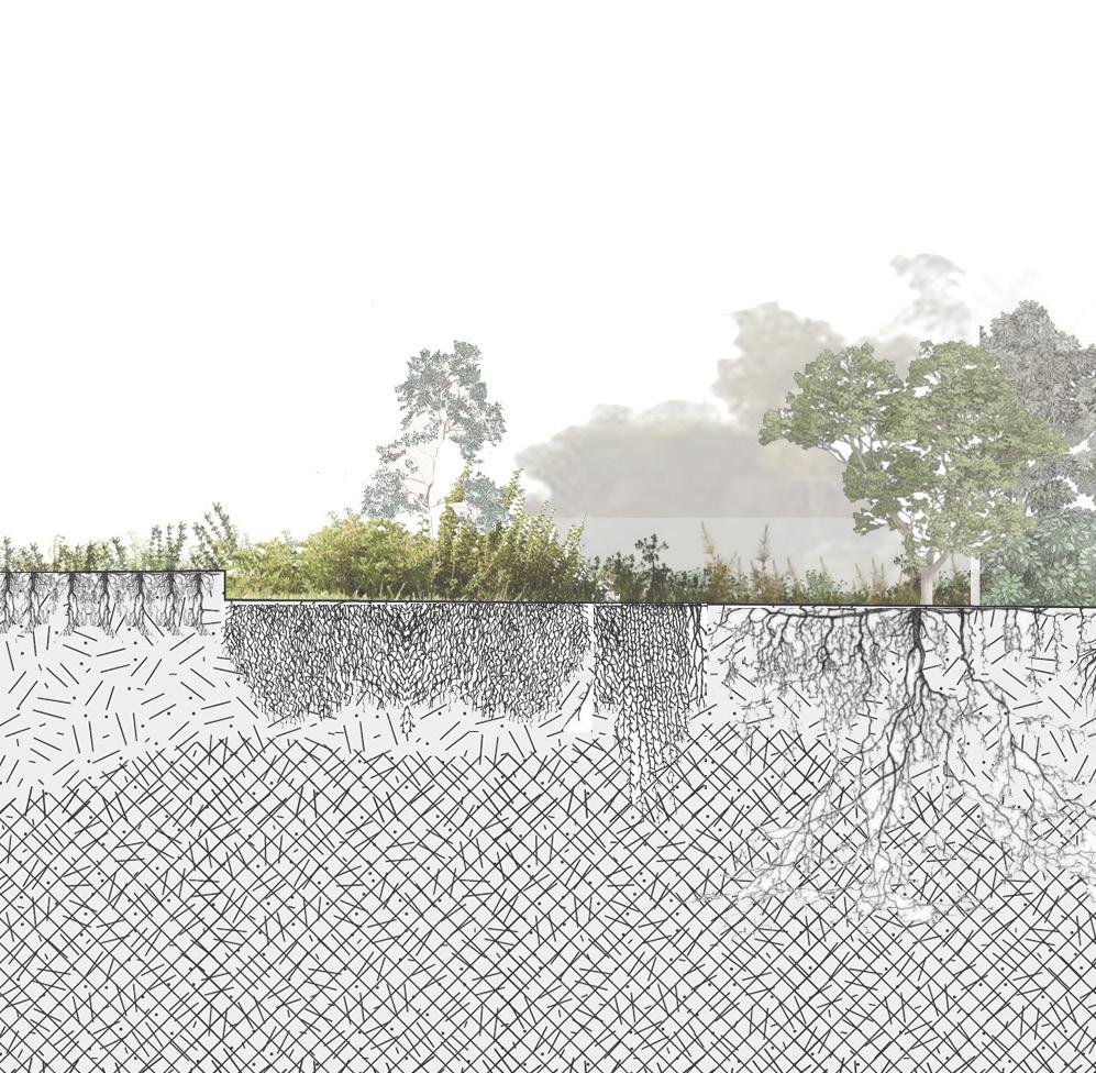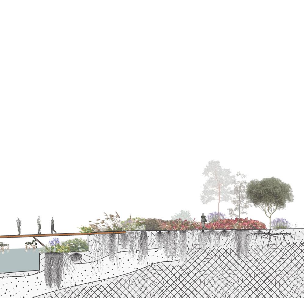 The proposal creates a new landscape, while ensuring the health of the new green areas by creating connections between it and the exising vegetation. Furthermore, the construction bridges the gap of connections existing on site (in terms of underground networks) while also linking insects and humans in this ‘designed’ cycle of nature.