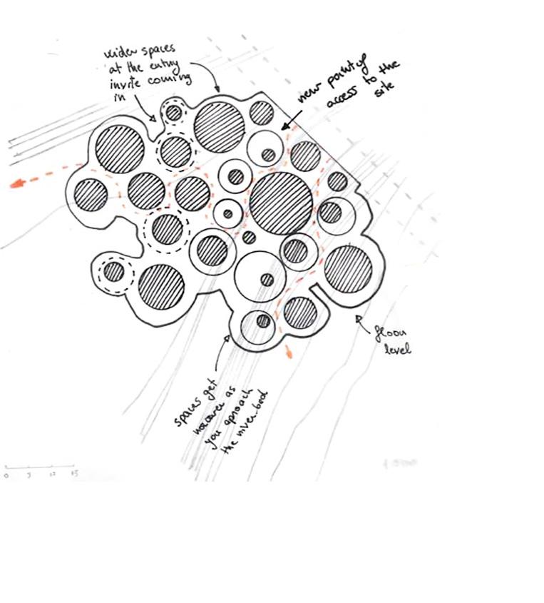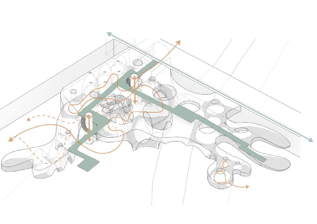 I further developed my concept at a scale of 1:500 by taking into account and trying to solve the accessibility issue existing between the drastic level changes found on site.