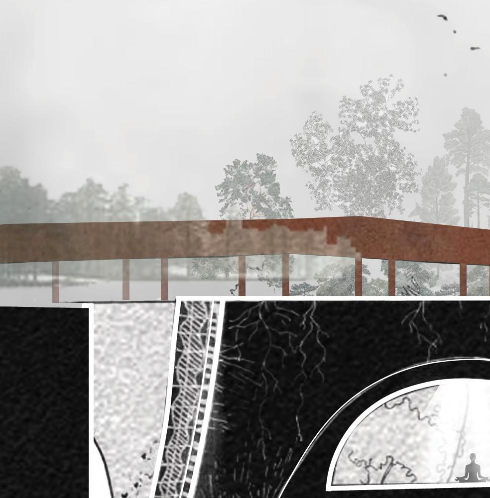 The Next step was to tackle the human experience. In doing so, my focus was on creating strong plays of light and challange scale in a way that produces a contemplative state for the user. I developed three types of spaces, in relation to the amount of sun and rain they allow through. They were then ‘arranged’ on site in accordance with the already existing conditions (mapped in img 2), as to disturb the vegetation as little as possible. The result created an environment in which humans can experience the site through the lens of non-humans. (in terms of climatic conditions)