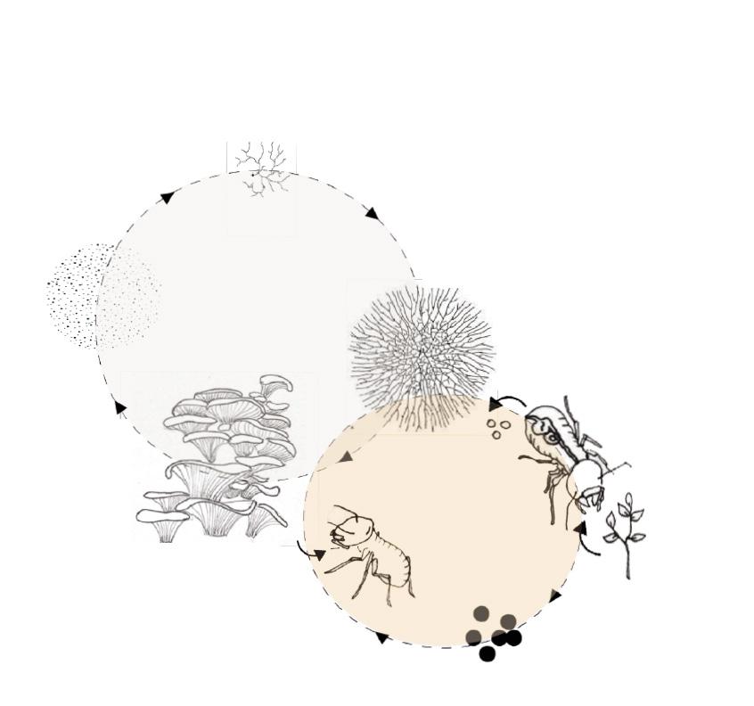 humans, fungi, flora and fauna (concentrating on insects as part of fauna). In this symbiosis humans will contribute with bio-based leftover products, in the shape of compost that will provide nutrientd for the mycelium in the colonisation stage.