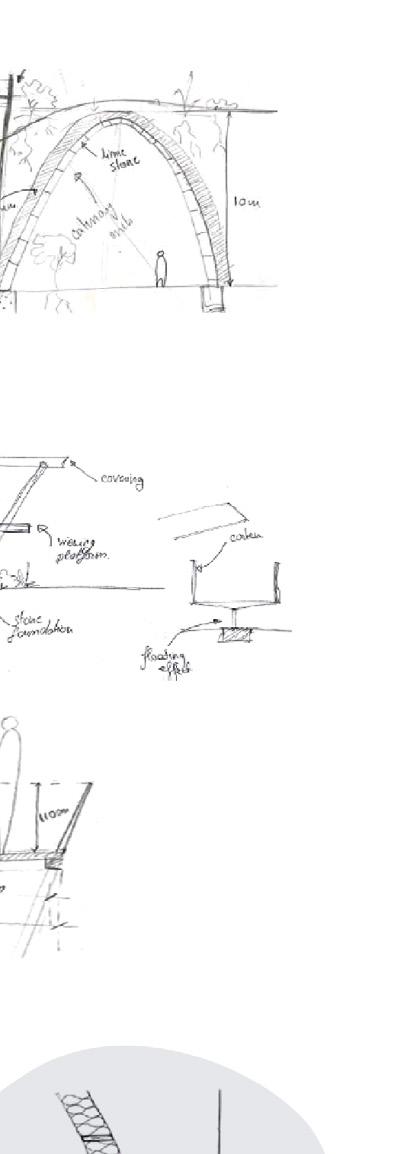 The construction process starts by carrying out sustainable remediation for site pollution. The concrete patch from the car park is removed and Alfalfa is being planted instead. Alfalfa contains triacontanol, a hormone which stimulates the growth of plant roots and enhances photosynthesis. Its high nitrogen content helps other organic material to decompose, therefore providing nutrients for other plants. The next step is to source the soil for the rammed earth and terracotta bricks. In doing so, the pond is formed. Following up the brick manufacturing on site, the structural element of the design is constructed with no local pollution from the development