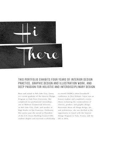THIS PORTFOLIO EXHIBITS FOUR YEARS OF INTERIOR DESIGN P R A C T I C E , G R A P H I C D E S I G N A N D I L L U S T R AT I O N W O R K , A N D D E E P PA S S I O N F O R H O L I S T I C A N D I N T E R D I S C I P L I N A RY D E S I G N . Born and raised in Salt Lake City, Laura is a recent graduate of the Interior Design Program at Utah State University. She completed two professional internships, one at Midwest Commercial Interiors in Salt Lake City, Utah, and another at Rapt Studio in San Francisco, California. Her senior year she served as President of the U.S. Green Building Council USU student chapter and received a scholarship