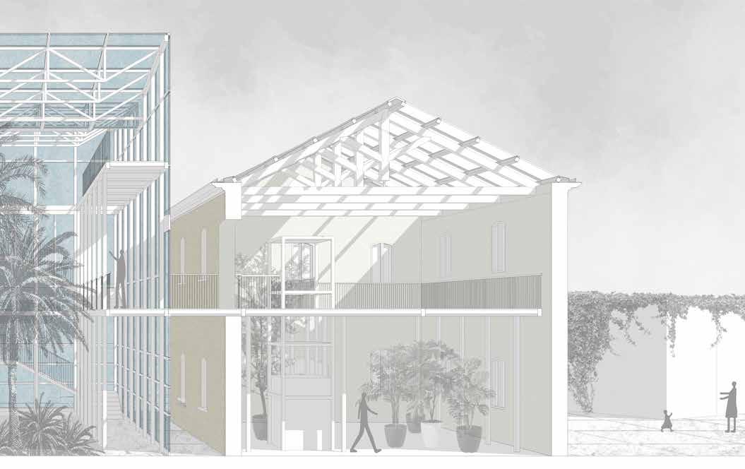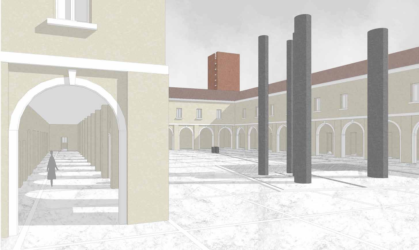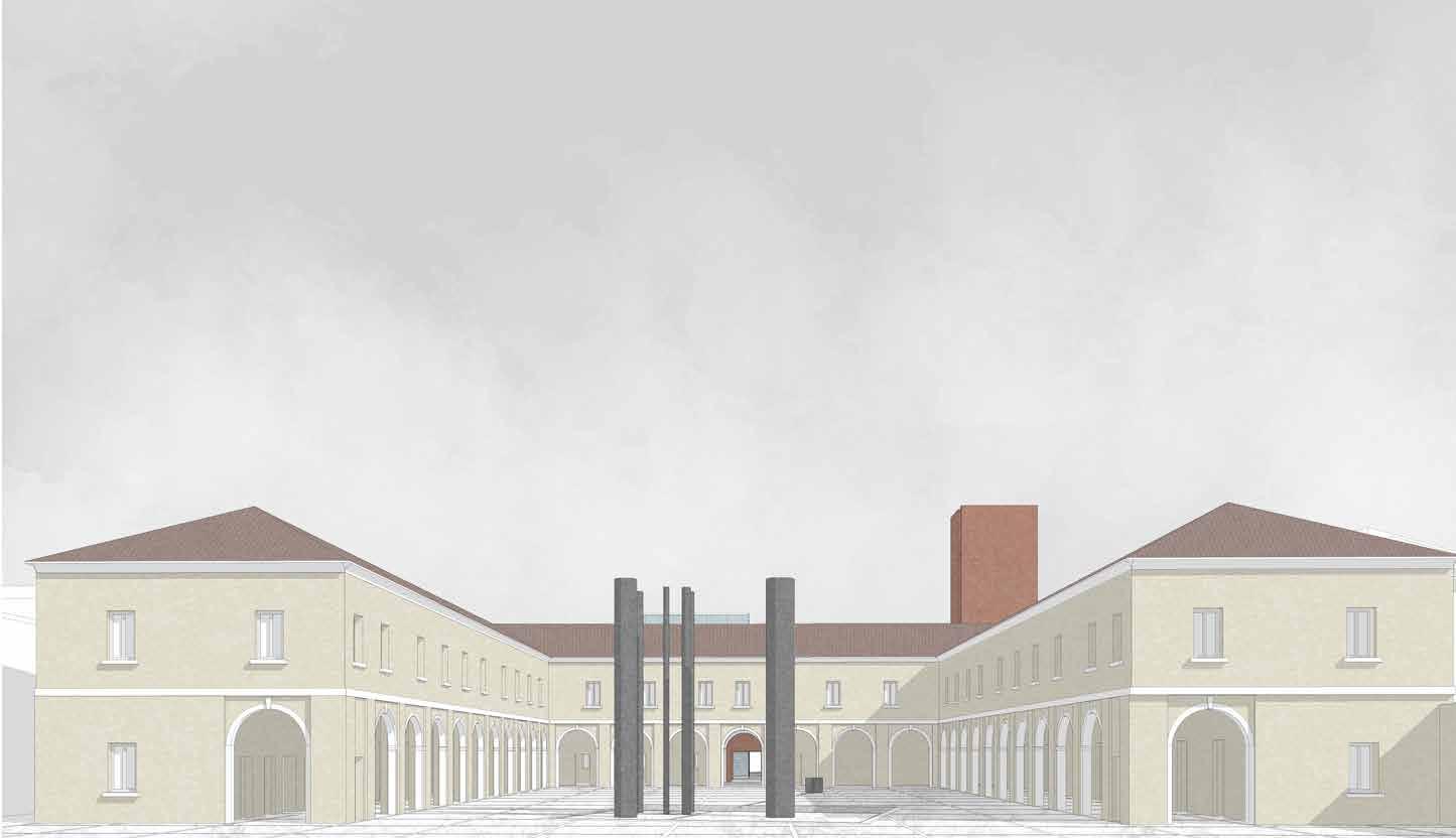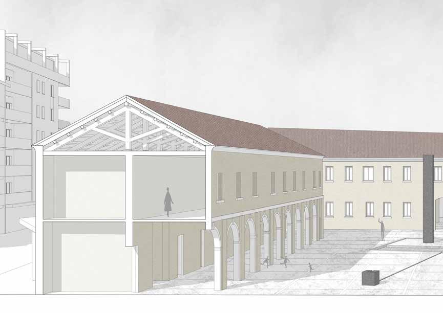 Configuring a sequence of rooms was the guiding theme of the project, giving shape to the desire to define a series of places, of urban rooms, and constitute a magical space, a meeting point, within the city. The buildings of the former convent of Sant’Antonio Abate - later the former military district - form the setting for these spaces. The interiors have been redesigned and rethought in relation to their pre-existing identity, enhancing certain characteristics and revealing new ways of being inhabited. Flexible and open spaces constitute the most public character of the new project - capable of hosting different functionswhile more private spaces open up instead on the upper floor, for the use and enjoyment of the citizens themselves. The porticoed space on the right also acts as a connector between the central courtyard - a metaphysical space animated by five characters - and the green belt that embraces and binds the different rooms. This outlines the leitmotif of the project, the continuous dialogue between nature and abstraction. The narrative continues on the different types of outdoor and architectural greenery. Beyond the metaphysical courtyard - an abstraction of nature - we thus find three types of garden: the urban garden, enclosed by a curtain wall near which stands a tower, its access portal and a privileged observation point over the city and the Livenza river; a winter garden used in the pre-existence, open and at the same time strengthened by consolidation works; and a controlled green, inside the glass volume of the Greenhouse.