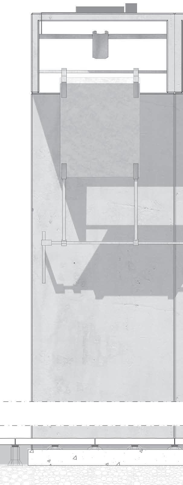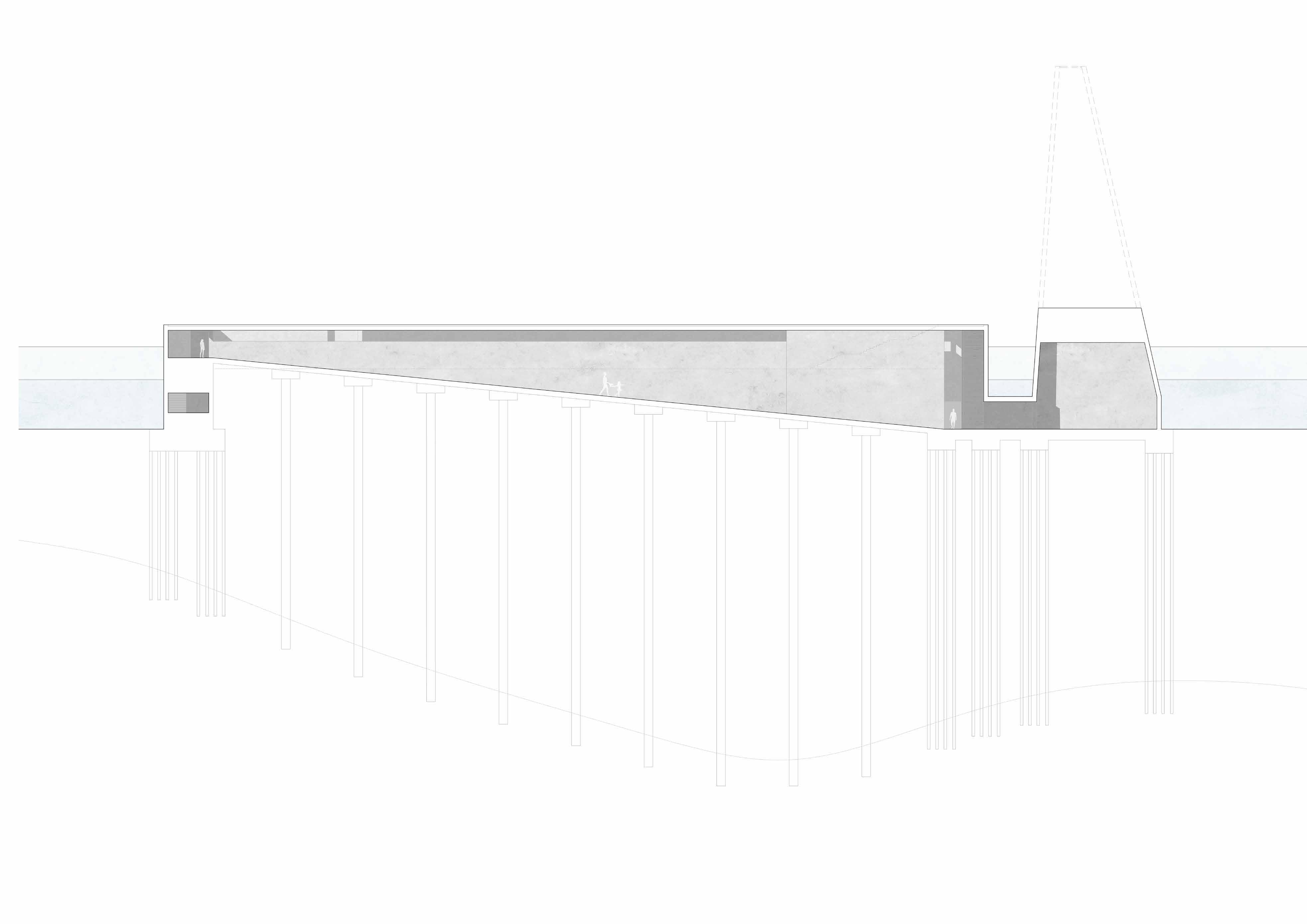 By responding to the fluctuating water level of the river, different configurations of the intervetion are activated at different times of the day: this way, nature is the deciscive factor for the use of the project. When the tide reaches a certain height, a framed outdoor pool is created in the river. As the water level decreases, this water drains naturally, creating a square. At the same time, more and more elements outside of the low, horizontal frame - the three spaces attached to the frame, that stand as reinterpretations of the historical archetypes - become visible, in a game of of hiding and showing elements played with the the water level.