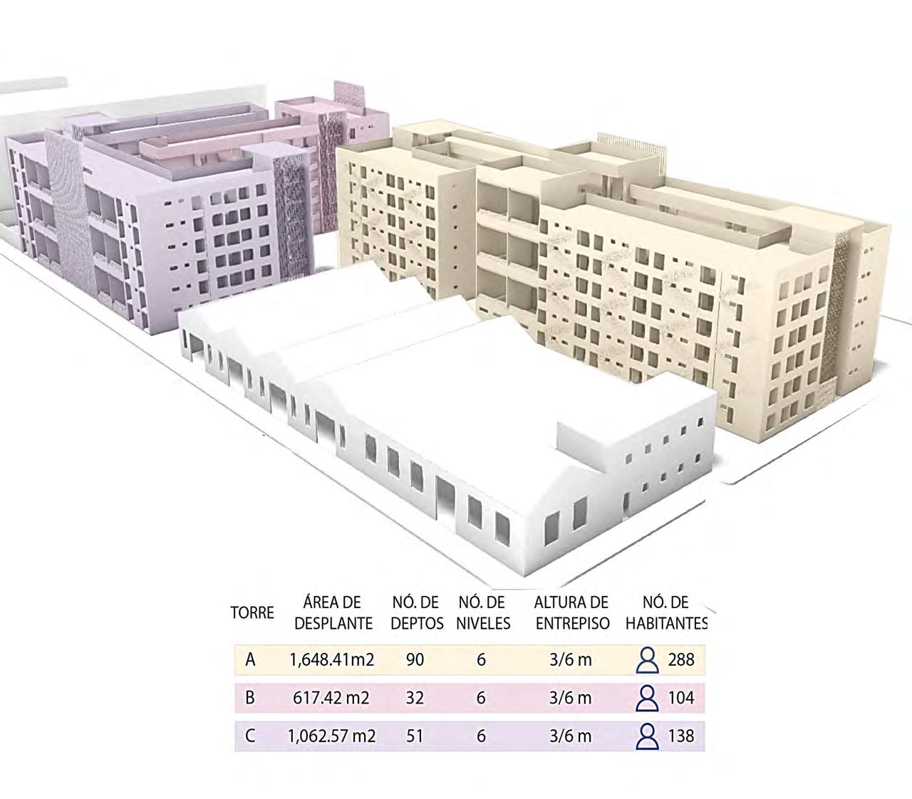 Los ejes rectores del proyecto nacen a partir de la idea de un recorrido dentro del proyecto. El cual se dividió en 3 torres de vivienda (con departamentos familiares, para roomies y tipo loft), mientras que en el predio patrimonial se implementó un área de coworking, librería, cafetería, y zona de comercio. Dando la rehabilitación a la herrería y a la estructura de acero e implementación de techos fotovoltaicos con diseño biofílico al usar muros verdes y vegetación interior. La identidad de la colonia se mantiene al usar materiales locales como el tabique.