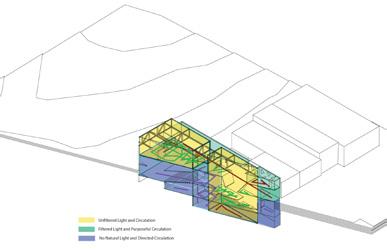 Diagramming became and important way to integrate light and circulation into the sectional qualities pulled from the site model. The separation of the library from the theatre helped to create experiential circulation both within the public realm and private realm. One of the goals of this project was to create connection between the street in front and the park behind, which was completed by repeating that experential circulation throughout the building. This project started my understanding of how people interact with each other and also with a building. The idea of how light interacts with different types of program allowed me to start thinking about how to categorize program in ways that allow for more interesting interactions between people.