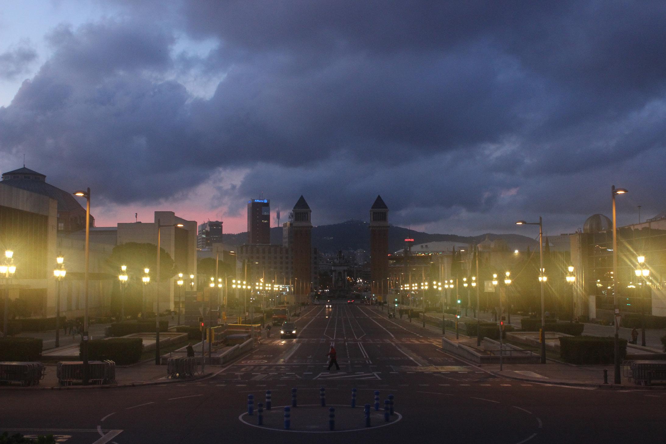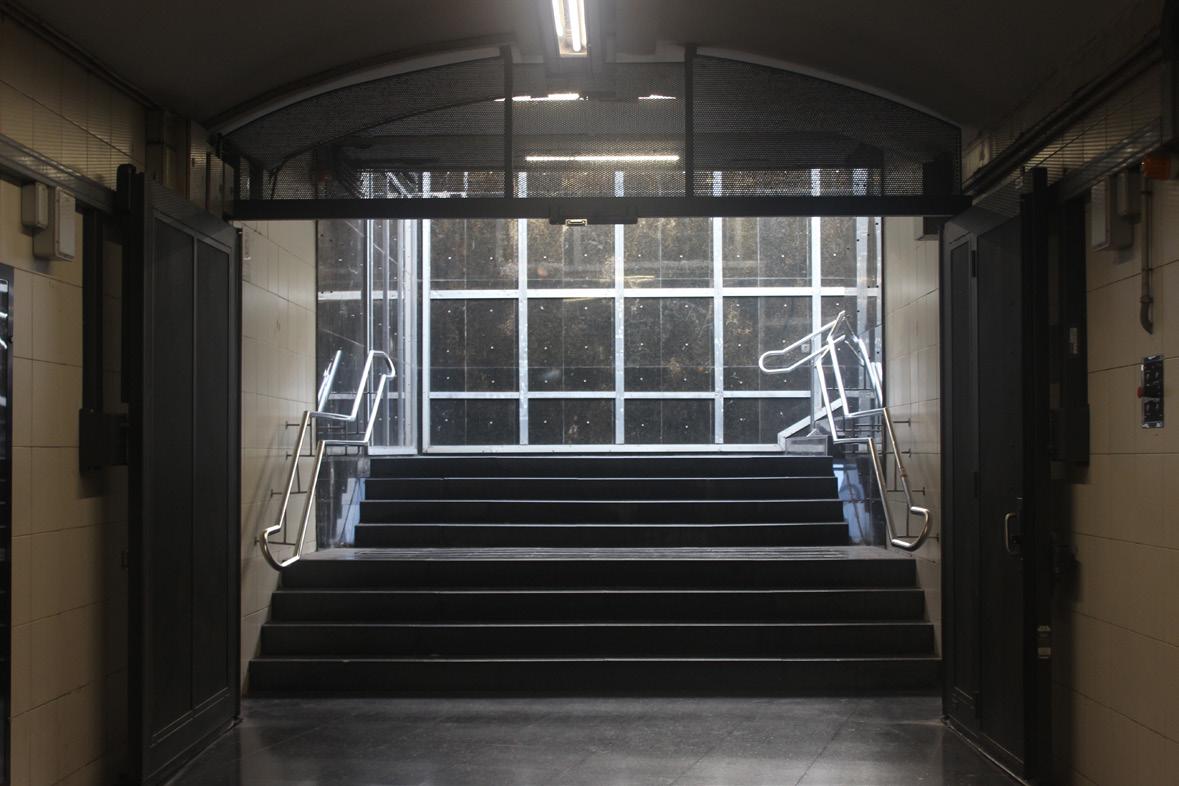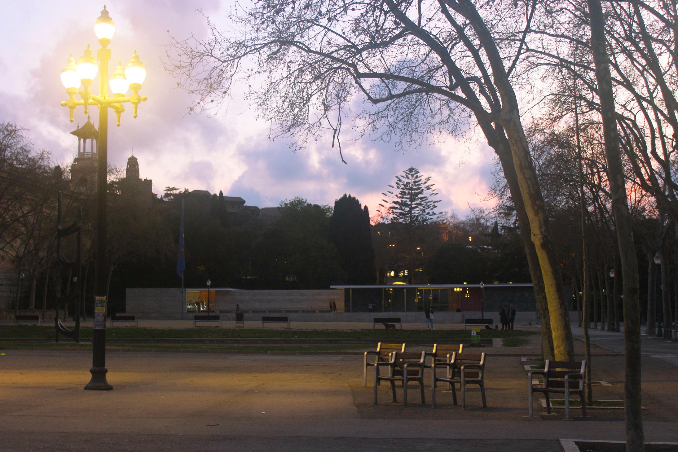 Llega la noche a Montjuic y acaba la jornada laboral. Podemos ver el Pabellón fundiéndose al atardecer desde el reflejo de la terraza de Caixa Forum. Escuchamos el repique de una iglesia cercana y el guardia de seguridad regresa al subterráneo.