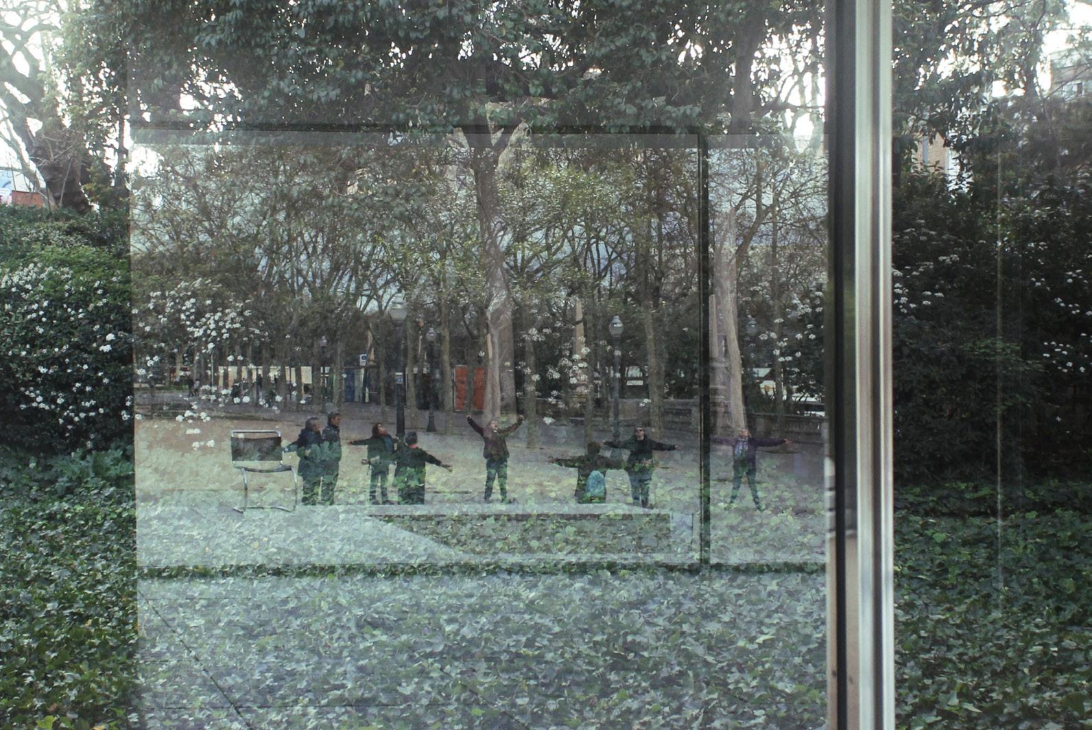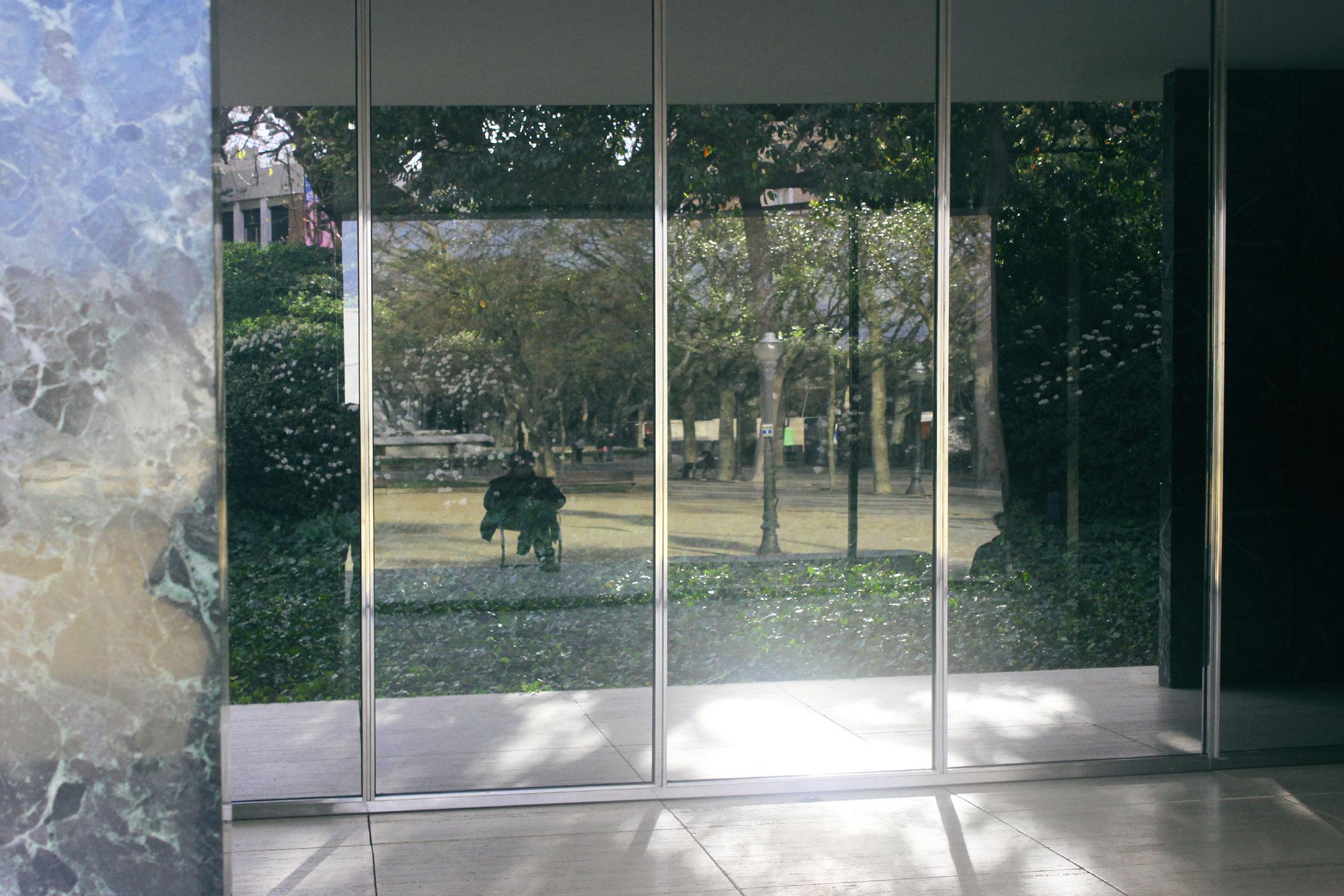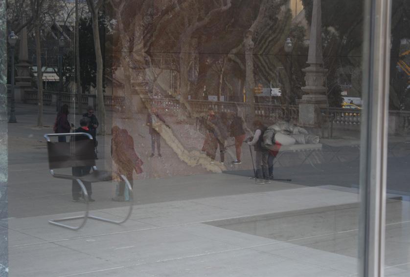 to, dejamos de prestar atención a lo que se decía y notamos que así como estábamos viendo todo el pabellón desde afuera, podíamos ver todo el exterior desde adentro del pabellón, a través del reflejo, como si las personas viviendo allí en el parque realmente hicieran que el lugar existiera. Nos quedamos un buen rato viendo pasar la ciudad por la construcción y pensé en ese hombre, cuyo trabajo era mirar todo el día, y todas las historias que podría haber visto solo por reflexión. Imaginaba ver pasar la vida todos los días a través de ese cristal como crónicas de la ciudad desde la distancia, siendo un tercero, mirando sin estar inserto, como yo en el tiempo que había pasado en Barcelona.