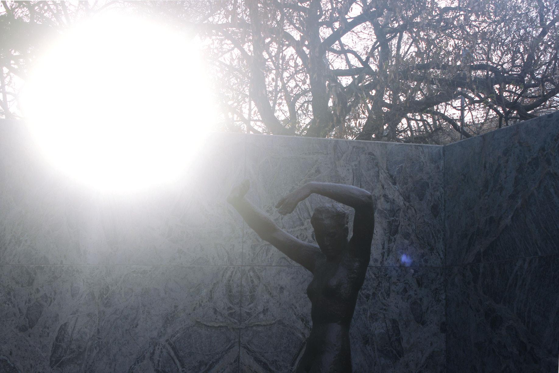 Vemos la estatua de “Amenecer” protegiéndose de la verdadera luz del sol porque, al igual que los demás, no quiere dejar lo que ven por las sombras.