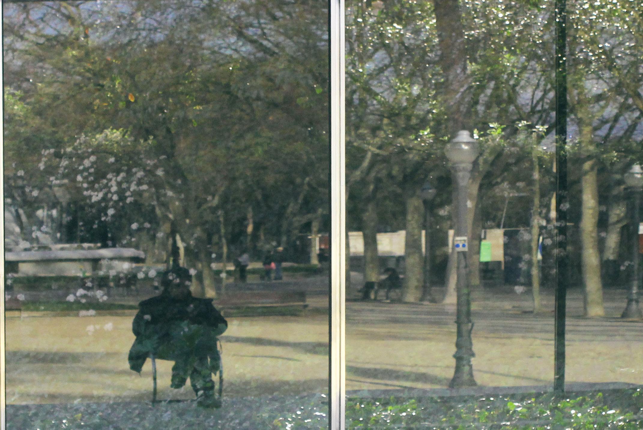 Vemos en el cristal a alguien usando el teléfono y luego a la gente viviendo el dia en el parque a través de las sombras del reflejo.