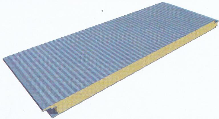 Panel de acero fabricado en proceso de línea continua con núcleo de poliuretano (PUR) o poliisocianurato (PIR) de alta densidad. Carga exterior en chapa galvanizada , prepintada o cincalum y cara exterior de foil de prolipro pileno