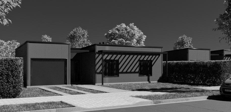 Una vez fraguada la platea de hormigón se procede a colocar los perfiles de fijación, para después iniciar la colocación de los paneles de muro, ya sea en forma individual o en blo ques constitutivos de paredes completas, se gún la tipología del proyecto. Los paneles de muro están conformados por dos chapas pre pintadas, levemente tableteadas una de color blanco y la otra gris pizarra con un alma de poliestireno expandido de 100 mm de espe sor que conforma una estructura portante y térmica de altas prestaciones, con un sistema de encastre macho- hembra, mejor cierre hi dráulico en el encuentro entre paneles, se guidamente se colocan los paneles del techo autoportantes y la zinguería de cierre y ter minación. Estos paneles cumplen con la ley 13.039 Buenos Aires del aislamiento térmico y uso racional de la energía, tienen gran resis tencia mecánica y larga vida útil. Se adapta a diferentes situaciones climáticas y resiste a las inclemencias del tiempo.