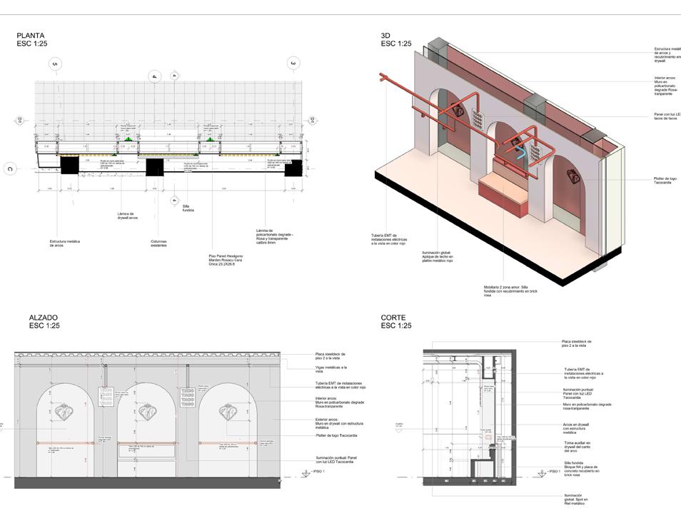 Desarrollo de diseño interior para remodelación de nuevo restaurante de Tacos ubicao en el centro de Bogotá, el desarrollo se basó en el concepto de la dualidad existente entre la vida/muerte de la cultura mexicana, cuyas relaciones se dan y celebran en la calle como el escenario mexicano en el que se desarrollan experiencias; por lo tanto, el diseño se divide entre espacios del amor, románticos y con colores vibrantes, y espacios que evocan a la muerte y la importancia de la misma dentro de la cultura mexicana, el espacio intermedio evoca a ala calle y a la cultura mexicana con espacios informales y de la temporalidad, tal como se da en las calles, rematando con el típico altar mexicano de la memoria.