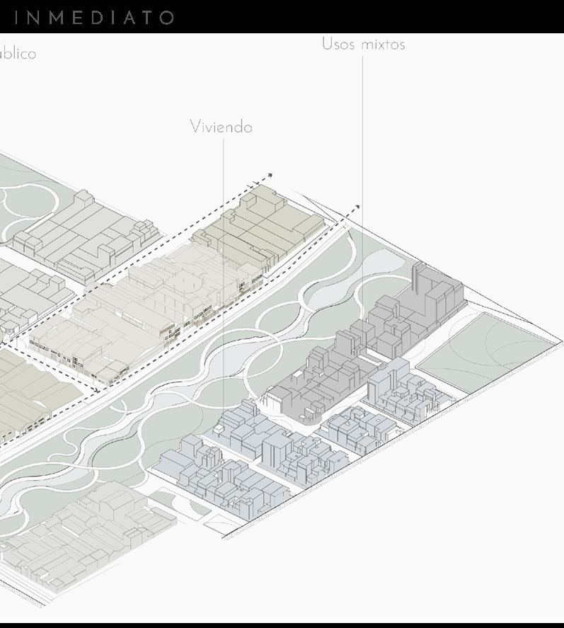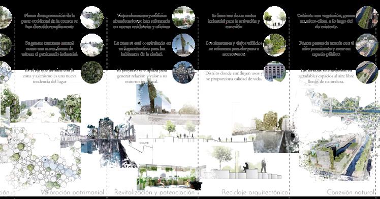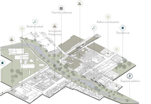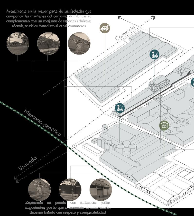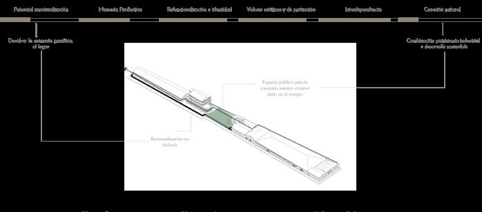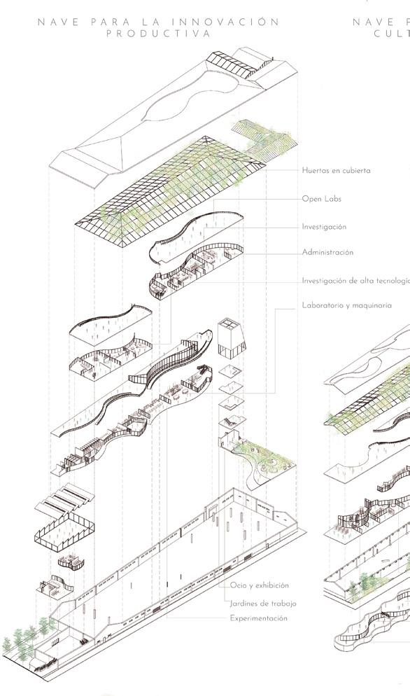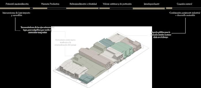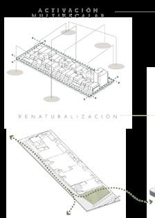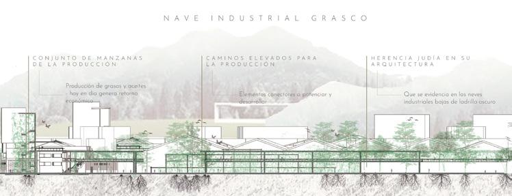 - La primera reconoce las naves industriales de Grasco como memoria productiva del lugar que se debe valorar y revitalizar, y la intervención se da de forma gradual por medio de la Re-funcionalización y naturalización de las naves productivas actuales.