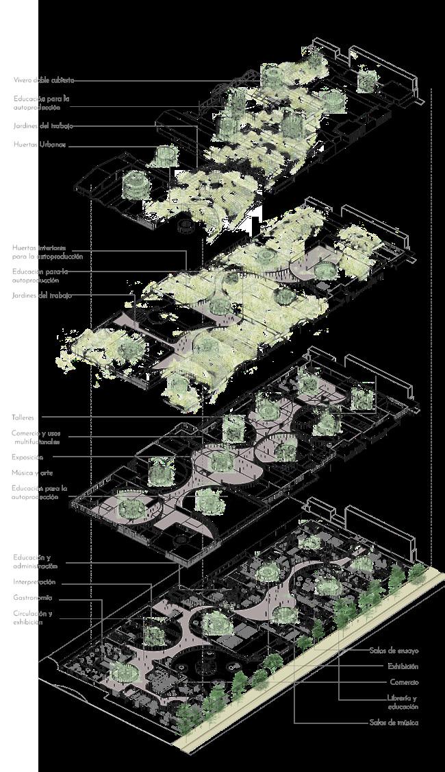 A partir de dicha escala intermedia, se llega a la arquitectura del lugar que entiende dos condiciones habituales del sector, tanto la memoria productiva impresa en las naves industriales de Grasco, que se interviene con estructuras desmontables que tienen en cuenta el valor arquitectónico de su emplazamiento; como la actividad del sector que genera arquitectura consecuente con actividades inmediatas, esta se interviene a nivel de manzana preservando la arquitectura actual y generando estructuras que permiten la entrada de naturaleza en su interior y exterior, así como la Re funcionalización de la arquitectura para abrir paso a la cultura, el reconocimiento de la memoria productiva y el fomento de la autoproducción mediante huertas