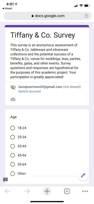 A survey was conducted to determine current attitudes toward the Tiffany & Co. brand, fine tableware and silverware, and a proposed Tiffany & Co. event venue. The survey was delivered via Google Forms, which is familiar and easy to navigate. Recruitment through social media was successful in gathering a small group of participants.
