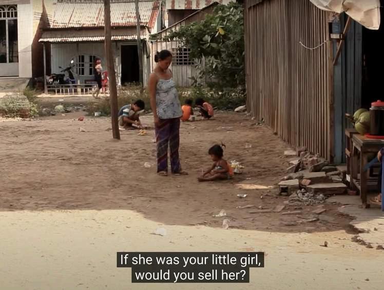 Like Brewster, Sworn minimizes the role that material poverty plays into trafficking: “So we carried out research [and] saw in some of these communities, it wasn’t actually the poorest families that were selling their daughters. It could be that some of the families that wanted to sell them for more luxury items like mobile phones, televisions, that kind of thing” (44:59). Since it was conducted as “research,” Sworn’s observation carries the authority of being factual truth, compelling us to view parents that sell their daughters as moral wrongdoers, rather than individuals driven by material necessity.