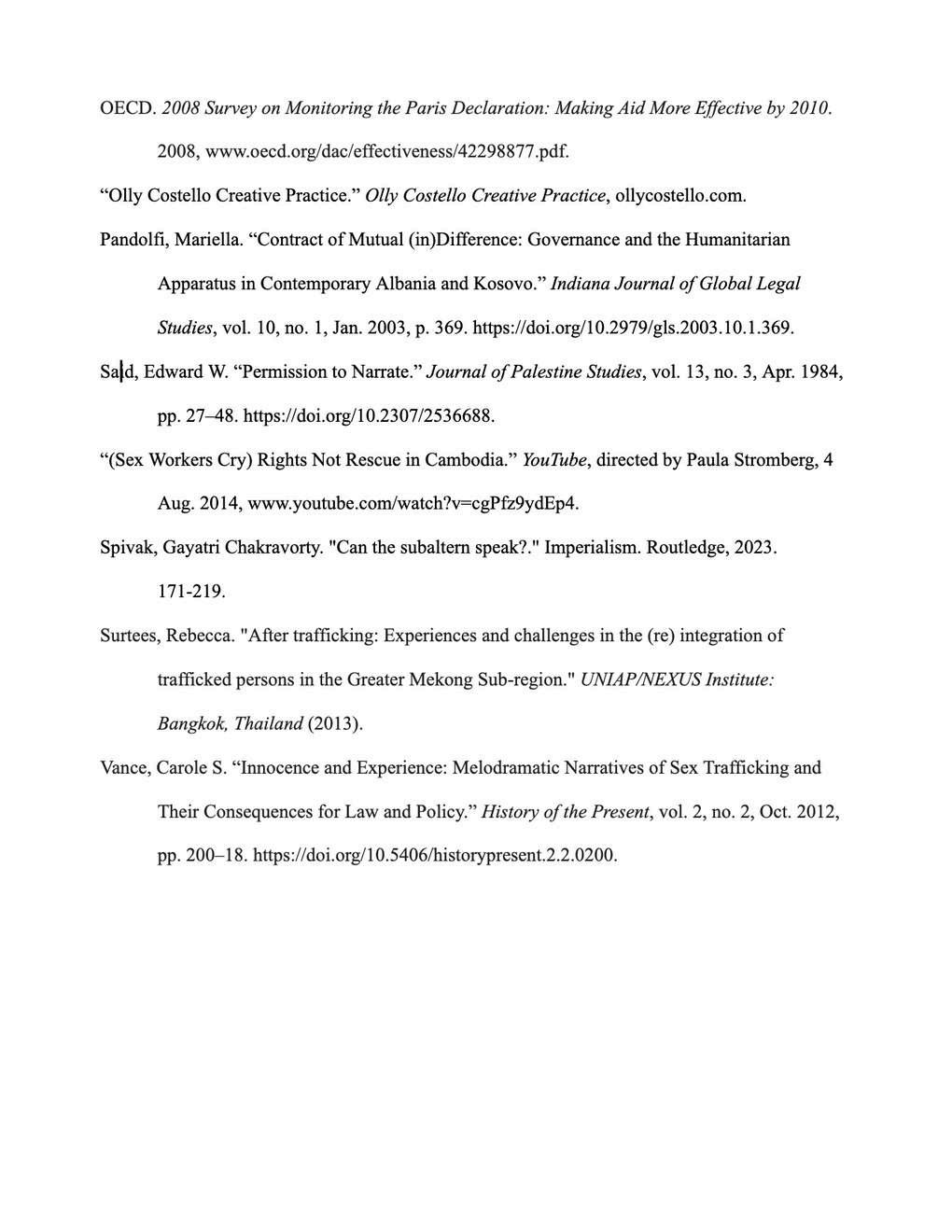 This zine serves as my final project for WGS 4500: Identity Politics, taught by Professor Denise Walsh With this zine, I intend to answer the following research questions: How do foreign actors of humanitarian intervention (i.e., anti-trafficking non-governmental organizations (NGOs)) reinscribe the marginalized statuses of sex workers in Cambodia through their media representation? How do anti-trafficking NGOs harm the very populations they claim to protect? How do Cambodian sex workers repudiate and resist this portrayal? While these are a few questions I attempt to answer throughout my zine, my collected research and subsequent analysis may beget more questions than answers.