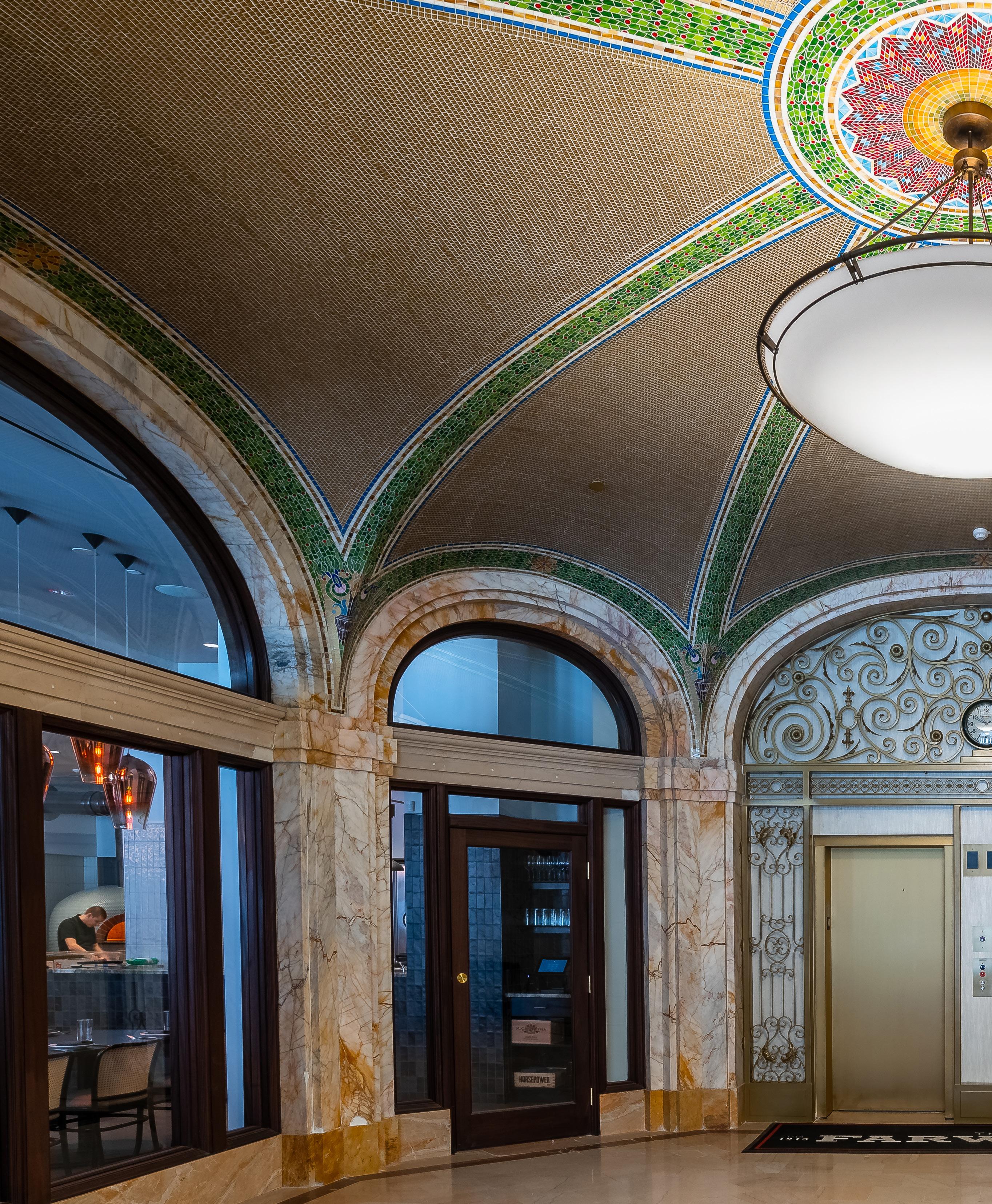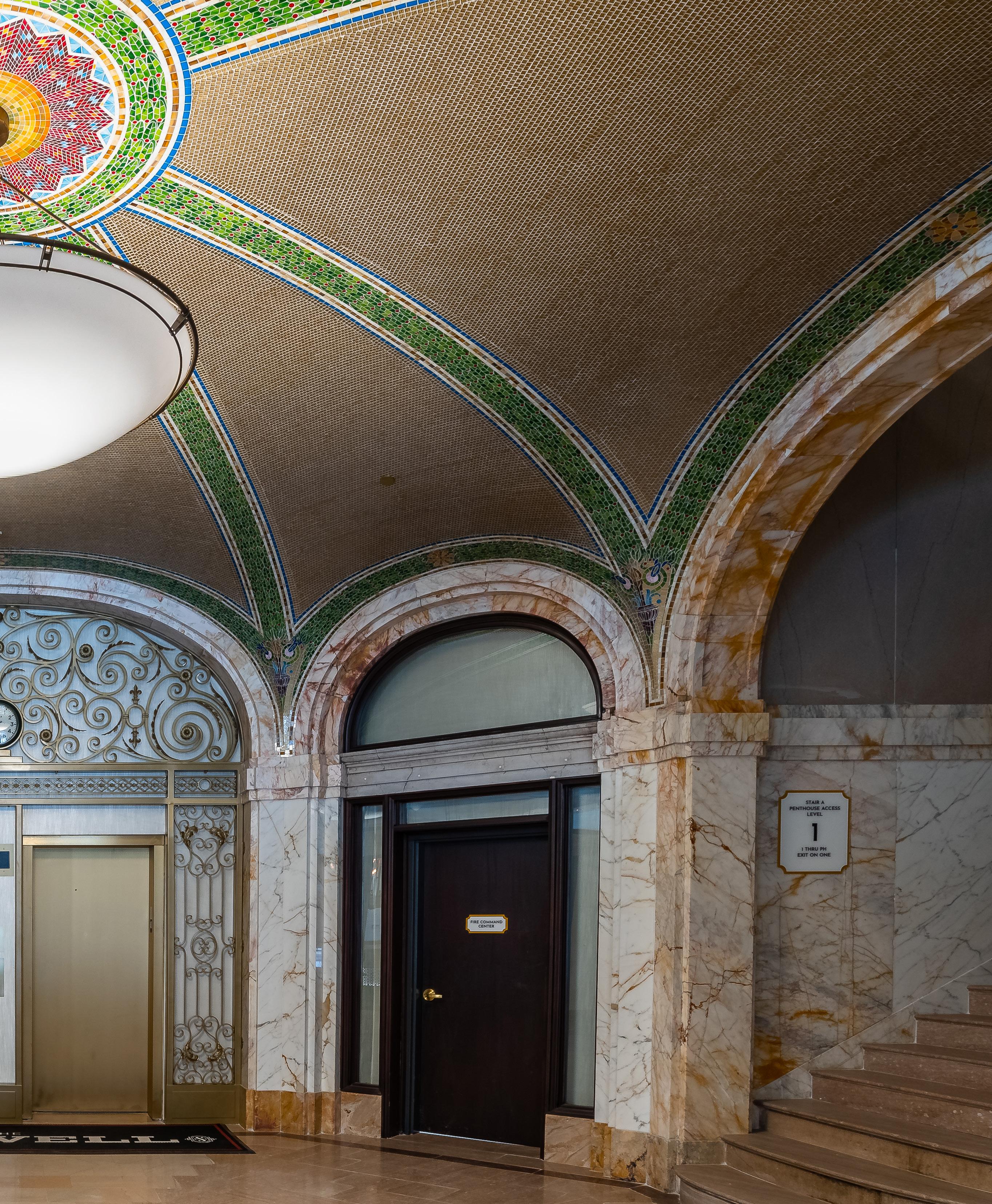 One of the main historic features of the building was the Tiffany glass mosaic domed ceilings in the lobby, with the centerpiece Tiffany glass chandeliers. The removal of the chandeliers n the 1970’s damaged the domed ceilings and mosaic tiles, leaving gaping holes in the plaster. The marble on the walls was severely cracked and damaged, and the cast iron scrollwork grand staircase handrail and decorative scrollwork brass elevator surround were both missing. The missing historic fabric was recreated based on historic photos and by referencing any remaining materials to determine colors, sizes, and patterns where possible.