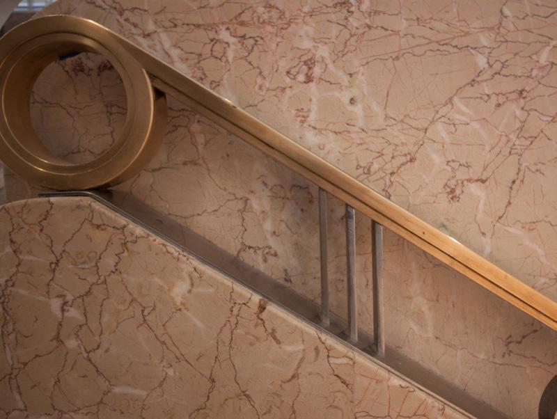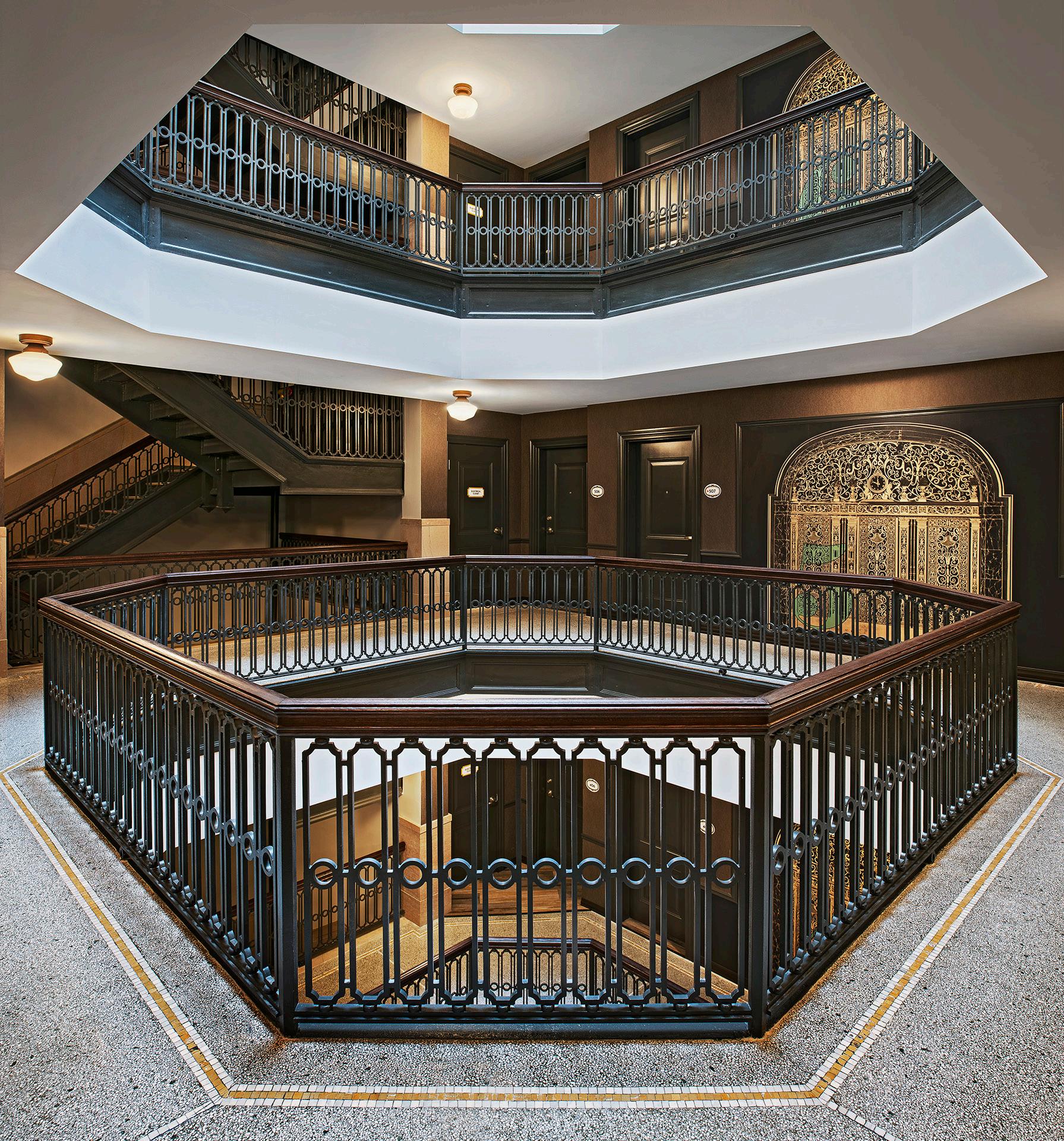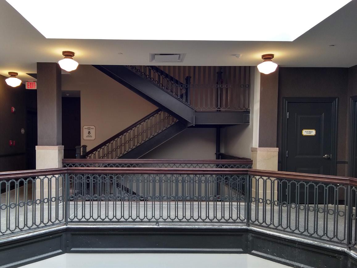 The guardrails around the atrium opening were largely missing. The remaining fragments were used to recreate missing pieces, maintaining this important piece of the building's fabric, despite only being 36" tall.