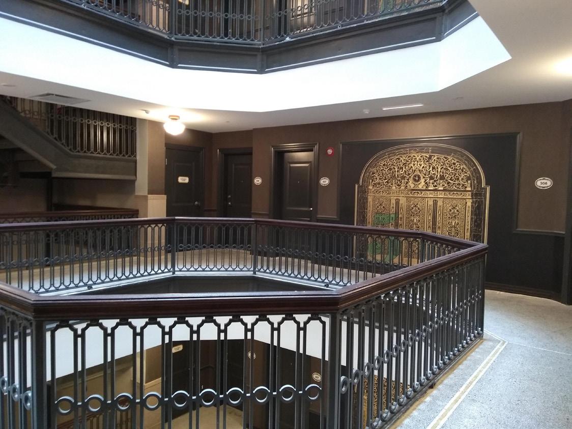The building originally had three elevators with decorative cast iron surrounds and wired glass doors. The three elevators were quite small to fit in the existing shaft and were not operational and could not be repaired. Since only two replacement elevators fit in the shaft, the openings were reconfigured, which involved removing, cleaning, restoring, and reinstalling the decorative cast iron surrounds to frame the modified openings.