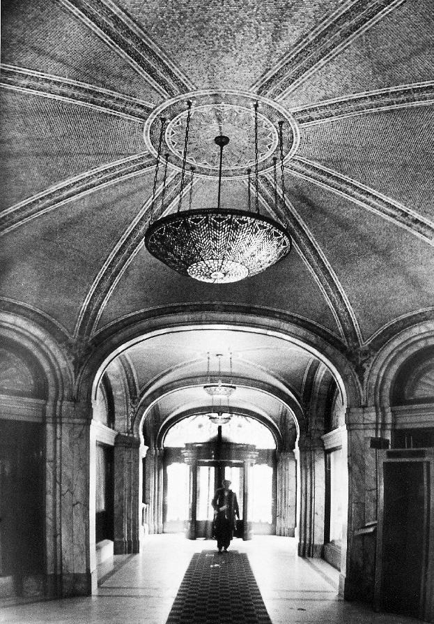 Built with high-end finishes including custom Tiffany Studios-designed architectural iron and bronze work and mosaic domed lobby ceilings, stained glass, and chandeliers, in addition to Greek Skyros marble walls and African mahogany wall trim, the building became a physical manifestation of Detroit's downturn, becoming fully vacant by 1984 and known as one of the most deteriorated historic buildings in downtown Detroit prior to renovations beginning in 2016.