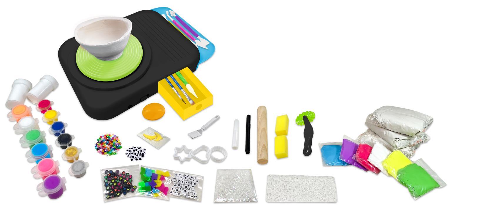 • Get the ultimate experience of creating your own pottery! Our custom machine has been made to handle classic ceramic clay as well as cloud like air dry clay using two detachable wheels