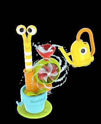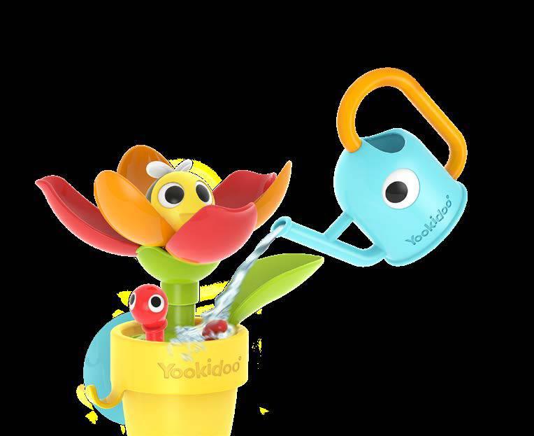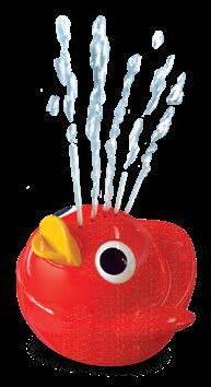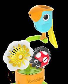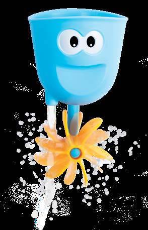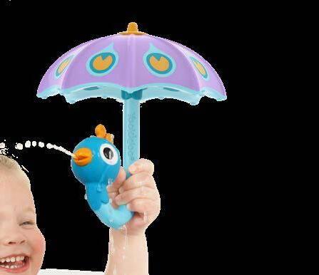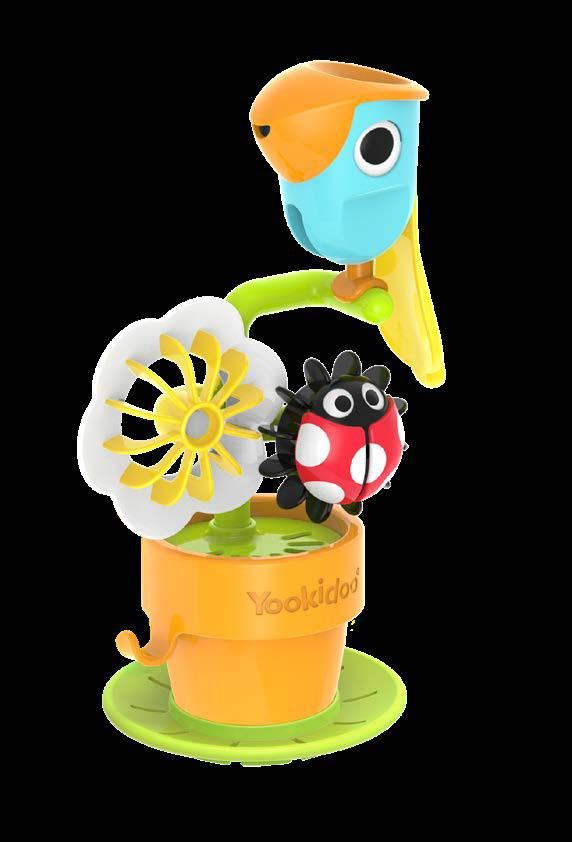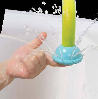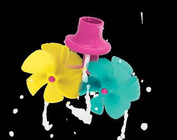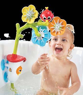 • A battery-operated Sensory Bath Mobile with colorful flowers that spin and sprinkle while swiveling bird sprays a gentle stream of water.