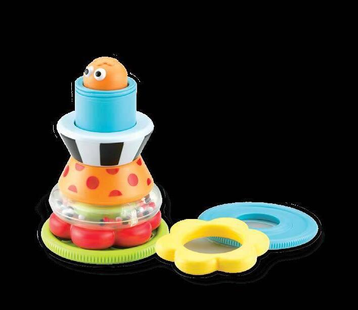 • 2 toys in 1: Spinning shell unscrews to become a 7-piece ring stacker toy with a push-squeaker face and a rattle ring.