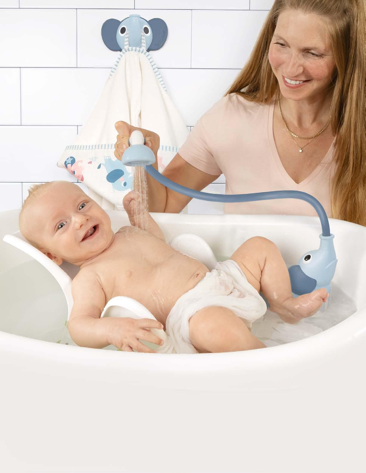 • The battery-operated, compact, and portable Elephant Baby Shower has a gentle stream. Its easy activation shower head makes thorough cleaning both safe and pleasurable. At a later stage, the Elephant Baby Shower can also be used as a fun bath toy.