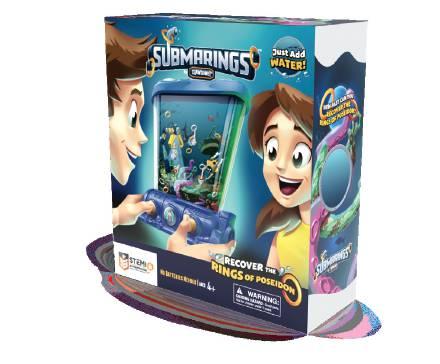Recover the mythical rings of Poseidon! Submarings is endless fun as you try to get all the rings on the pegs through the power of water. For kids 4 and up. Includes 21 gold, silver and bronze-colored rings, a crystal-clear water tank, and 2 interchangeable plastic panels featuring 4 fun deep-sea scenes. No batteries or Wi-Fi needed.