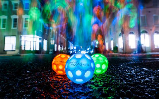Goodnight, sunshine. Hello, Moonshine! Play in the dark with the new light up Moon Ball. Bounce to activate the colorful orange, blue, or green light.