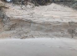 A look at some of the cliffs at Gullane will show strata made up of sandstones and mudstones – the differing grain sizes suggest different environments of deposition. As a rule of thumb, finer grained rocks have been formed in slower moving waters than those with coarse grains. This makes sense if you think about current waterways and their beds. Lakes, ponds and slow moving rivers tend to have silty beds, whereas fast flowing upland streams have rocky bottoms.