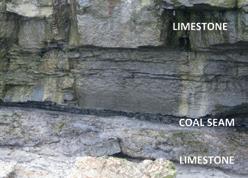 Some sedimentary rocks consist mainly of organic remains; these are known as biochemical or biogenic rocks. The shoreline and low cliffs at Whitesands are perfect for viewing these. Many of the strata here are of a light grey rock containing numerous fossils. This is limestone, a rock largely made up of the mineral calcite which is strongly alkaline. In this case the calcite is derived from the shelly remains of ancient sea creatures such as corals. The same cliffs also host thin beds of coal, a rock derived from the plant remains from dense swamp forests which existed over 300 million years ago.