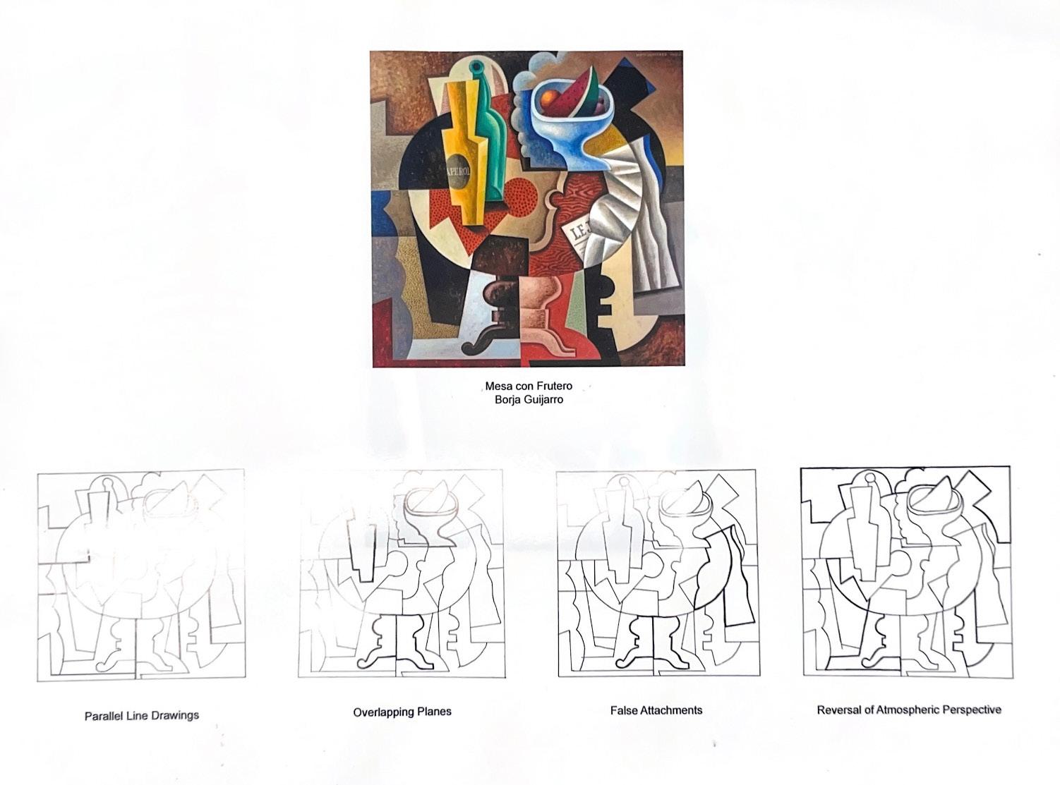 On the given site, you will create a figure ground study to develop 3 fields that represent a primary, secondary and tertiary grid on the landscape. The 3 fields should have a strong reflection of the cubist painting. This mapping will establish the given requirements and reinforce any existing conditions. All site requirements should define the space with the help of edge conditions, landscape elevation changes, the Fibonacci sequence, and the defined relationship from the cubist painting to the site.