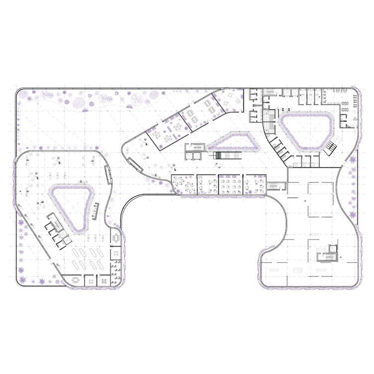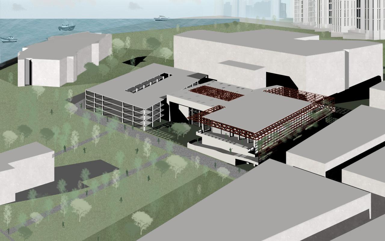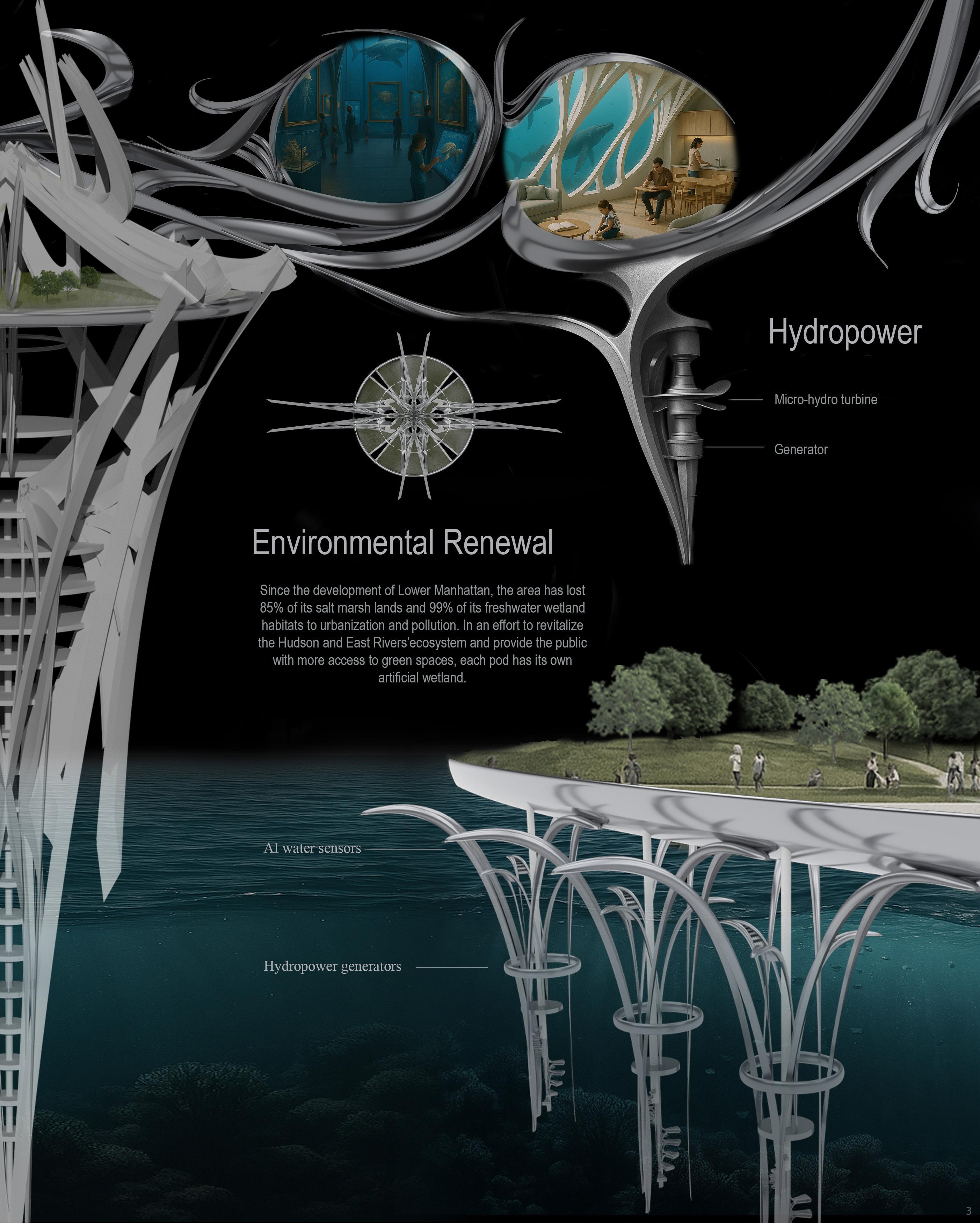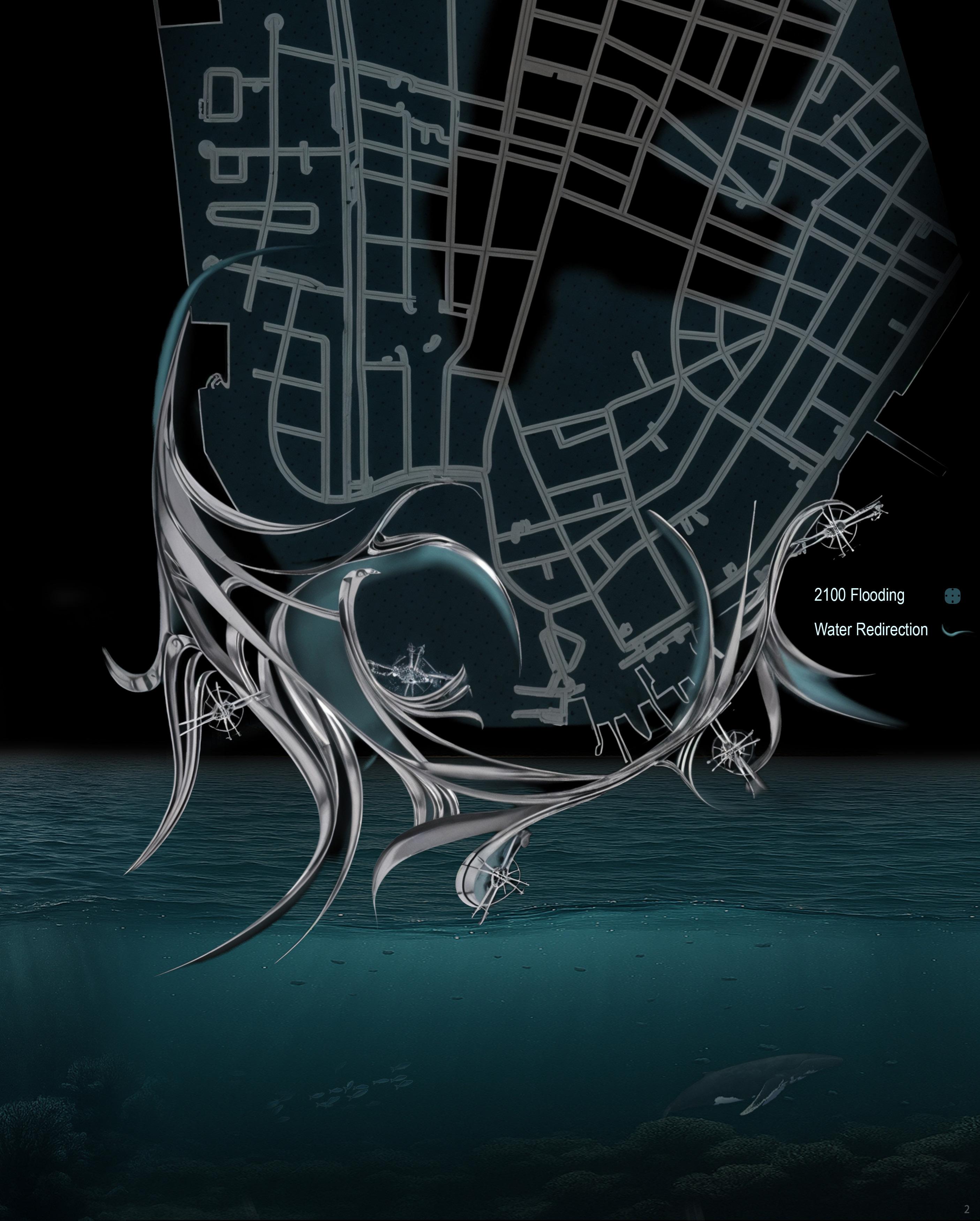 The project develops from a network of spine-like structures that extend the city grid into the waterfront, transforming flood protection into inhabitable infrastructure. These spines act as barriers, circulation routes, and ecological frameworks, mediating between land and sea while enabling urban growth. Floating pods attach to the system to host housing and community programs, creating an adaptable network where movement, habitation, and resilience merge into a new model for coastal living.