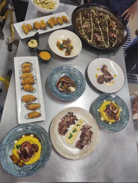 1. Cut some tentacles to fry in the pan. 2. Serve with mahi mahi mahi with french fries and roasted pineapple chimichurri and ali oil